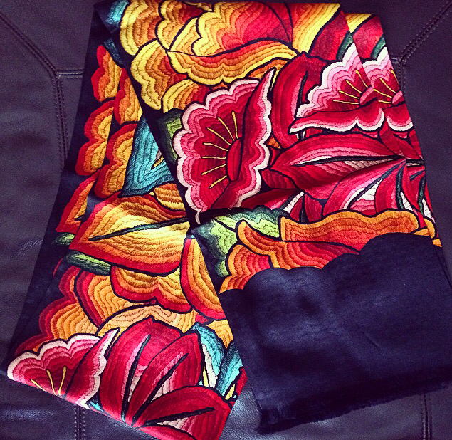 “Las Flores de Juchitán” translates into The Juchitan Flowers. This beautiful scarf from the famous fashion house Pineda Covalin accentuates the flowers in the Tehuana’s dresses and silk embroidered daisies.