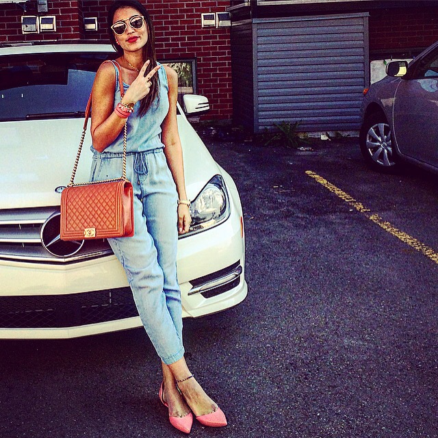 I am dressed in a Splendid jeans jumpsuit which I love becaue of how comfortable it is. I accentuated the outfit with Phillip Lim flats and a Chanel boy. With a “50 shades of pink” mindset, I accessorized with Dior tribal earrings and a Balenciaga wrist band. Not to forget my favorite sunnies from Dior.