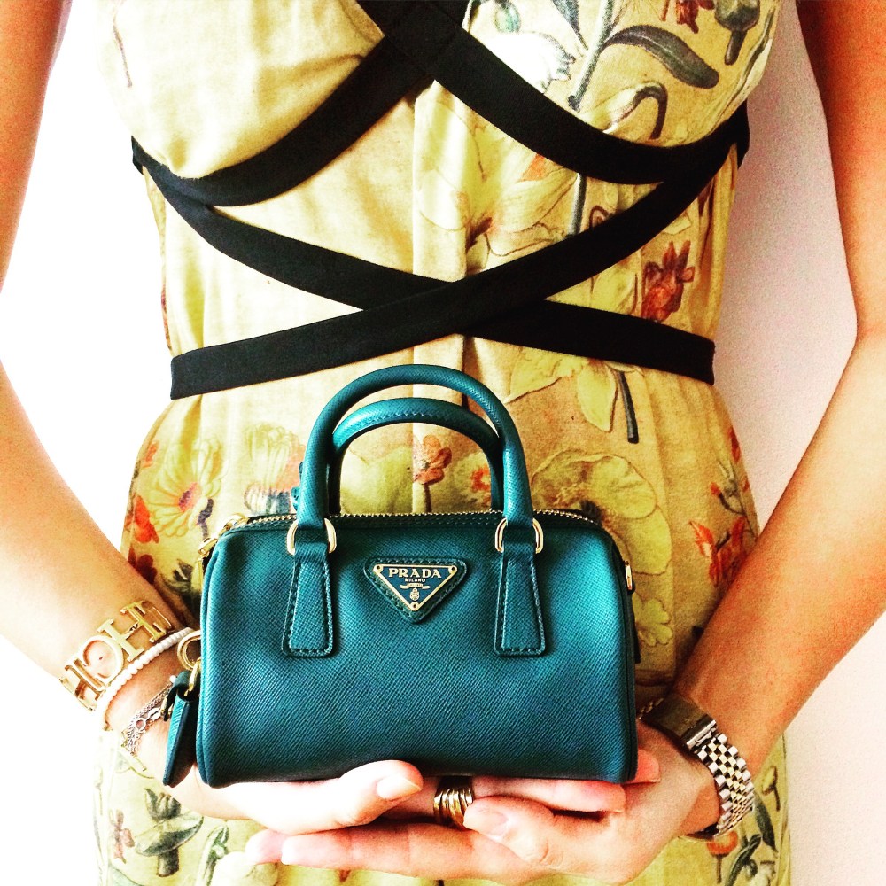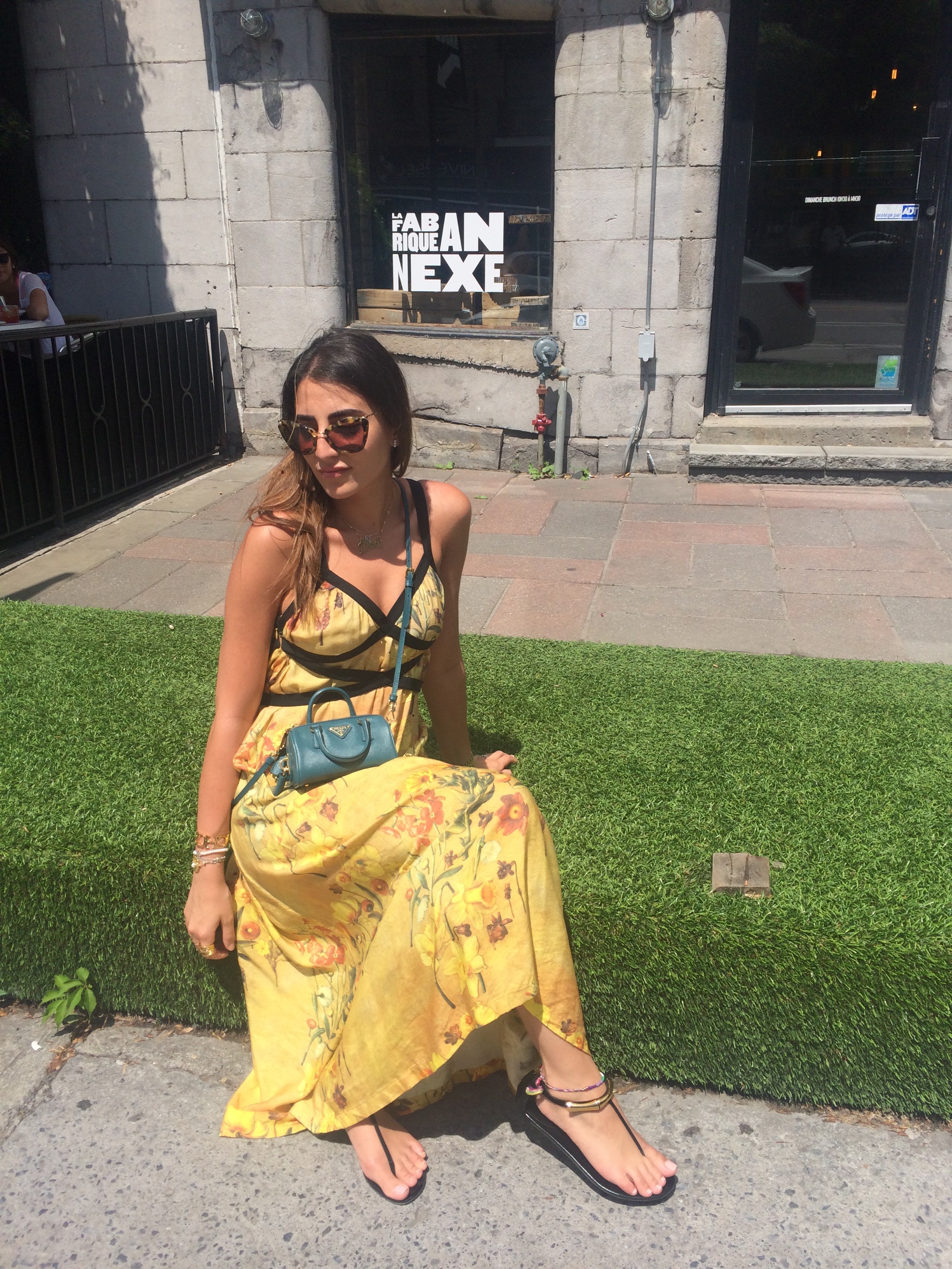 It’s a perfect day for a brunch outdoors. This cute and cozy terrace at Café Cherrier is the best idea for this weather. Enjoying the sunny weather, I am dressed in a handmade dress with a flower pattern along with a mini Prada Saffiano in Green. Both are styled with Gucci flip flop sandals and its golden detail on the ankles along with Miu Miu’s tortoiseshell acetate and gold-tone metal, aka Cat-eye sunnies.