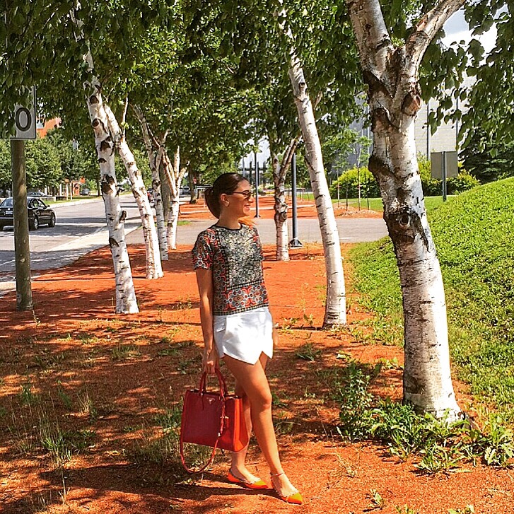 Today’s outfit has an orange accent through the patterny top from Topshop, the Maison Valentino Neon Rockstud flats and Prada Saffiano in Duo orange/red. These skirt/shorts from Zara are very practical and go with everything. And finally two shade sunnies from Dior.