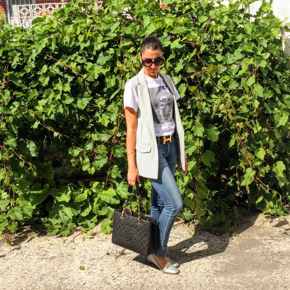 Vests are perfect to style an outfit! I find them an important closet item and they could change a “plain jane” look to something more fashion-forward. Topshop has a great selection of vests in all styles and colors. One of my favourites is this grey vests which could be dressed down more casually or part of a night-out look. I am wearing it with a simple white T, Citizens of Humanity jeans and Prada silver glitter loafers. The accessories include the Hermes H belt, Chanel classic shopping tote and Prada sunnies.