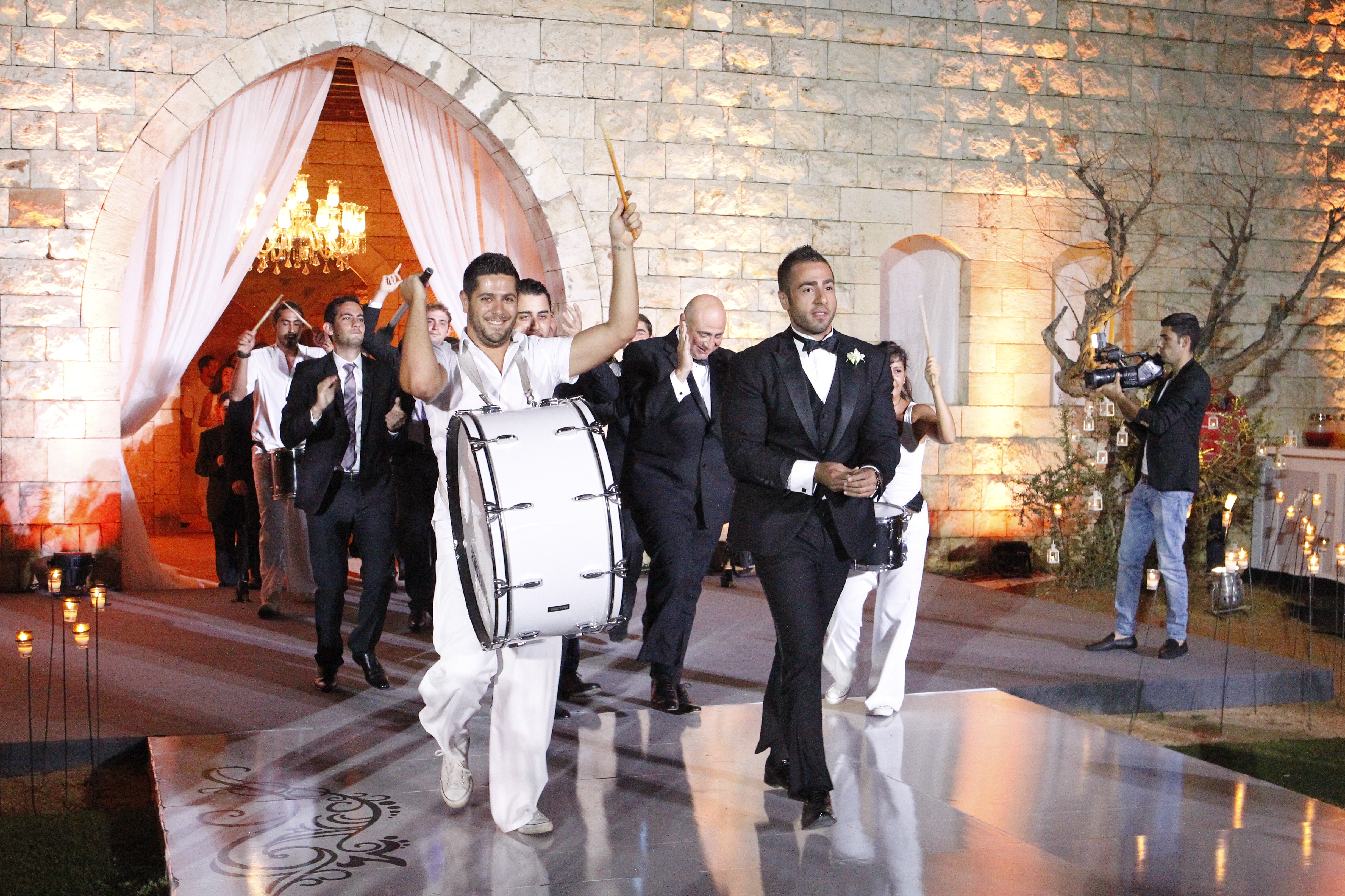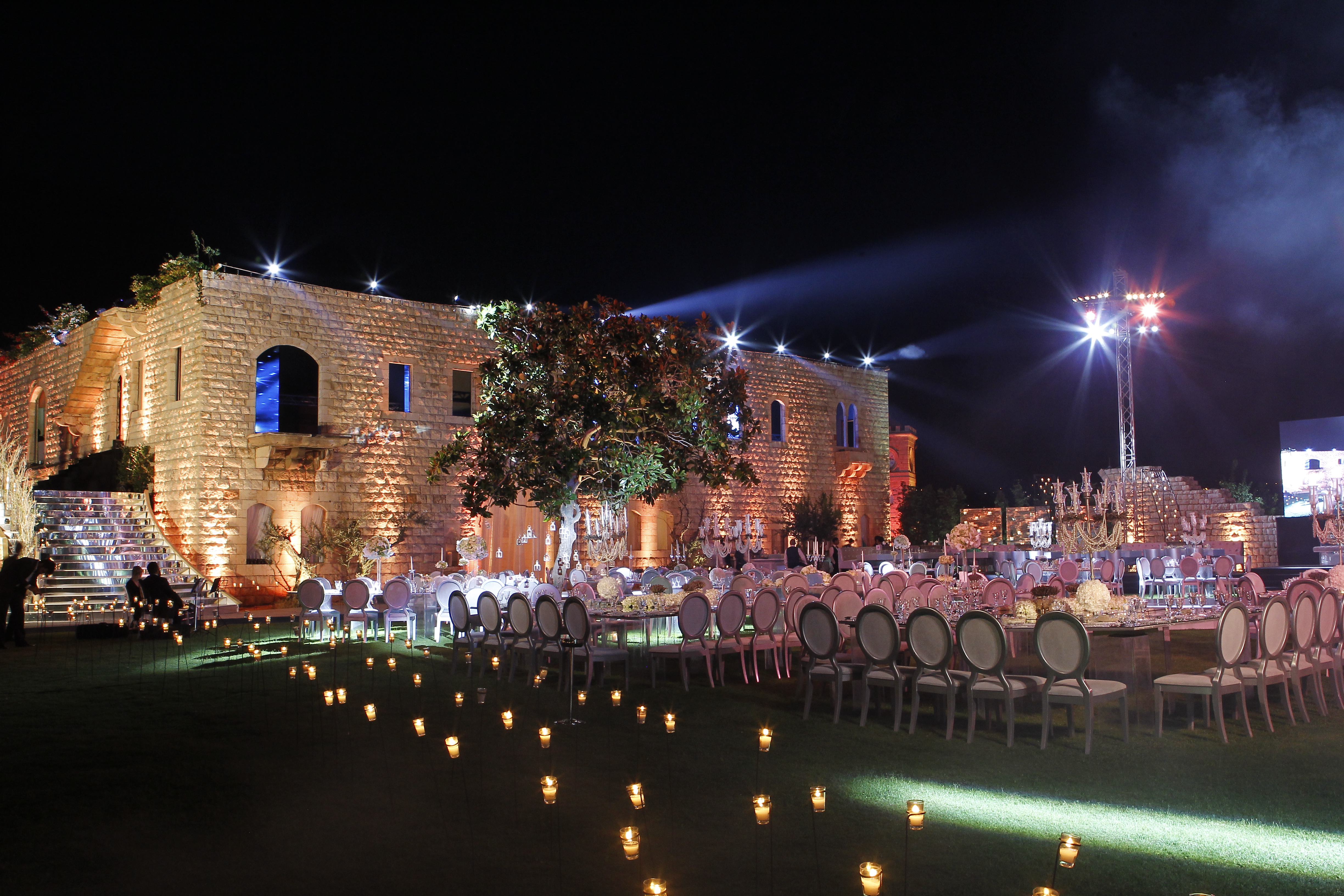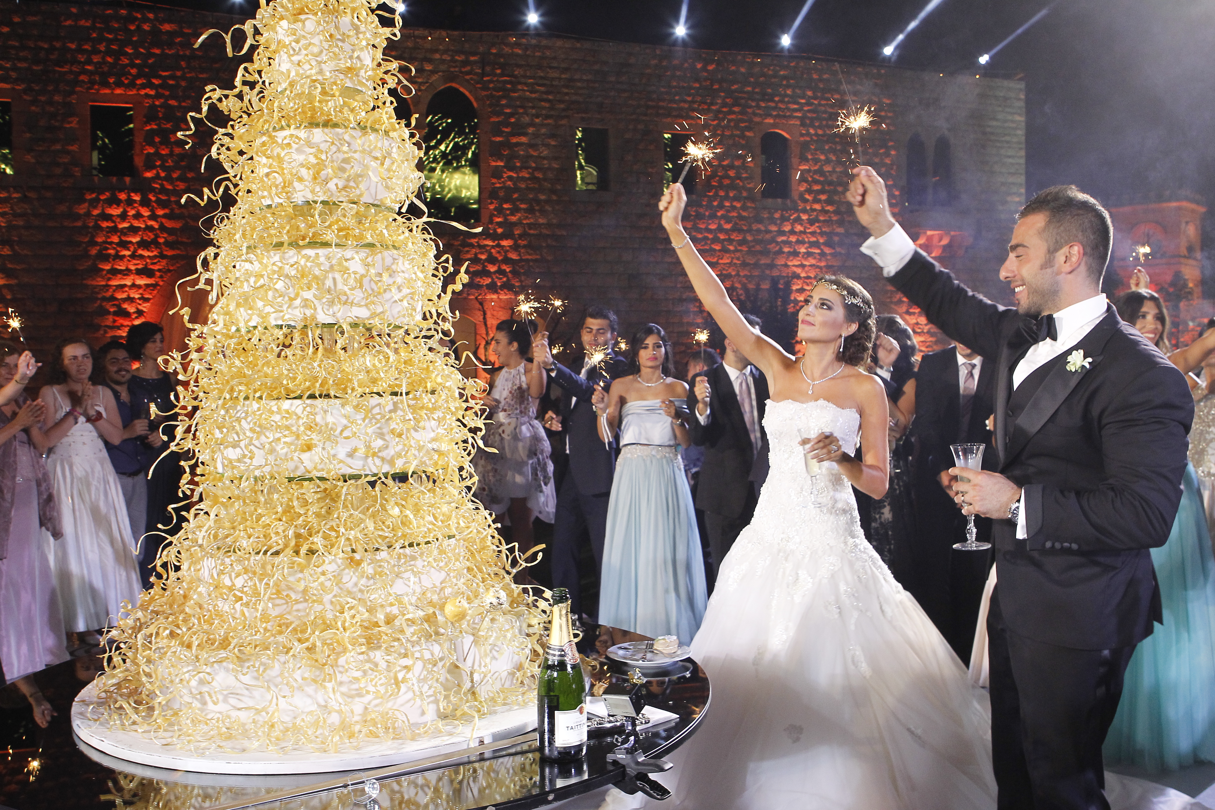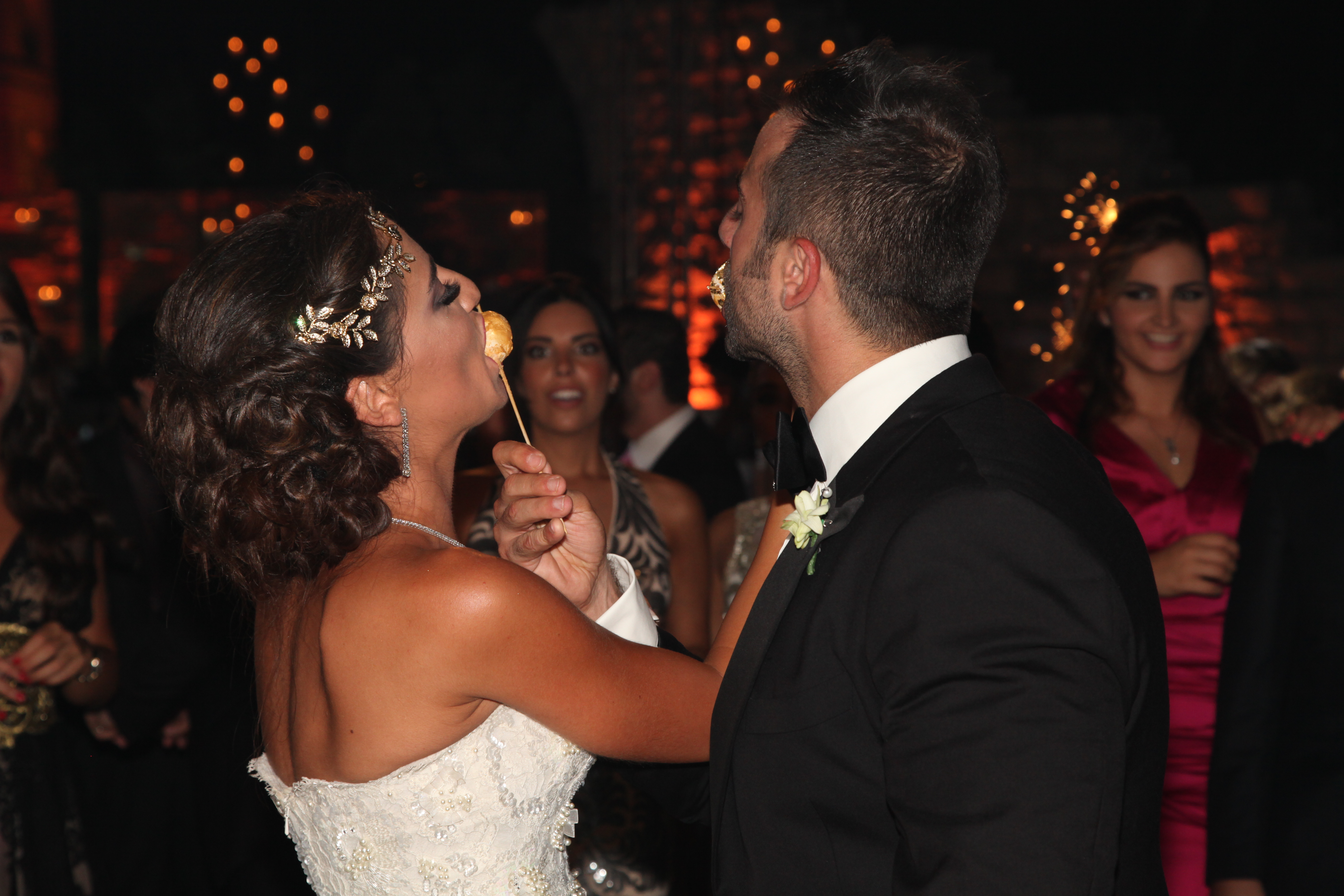 Vintage meets modern is the customized theme on which I built all the wedding details. Chateau Musar was a beautiful empty castle and every single detail and idea of this magical night was personalized and built from scratch. I had the honour of working with the amazing and professional team at Paul Nasr, which also made the several months of wedding planning overseas much easier. I am a very detail oriented person and every corner and every bit of that day was customized according to me and my husband’s personalities. The vintage character of the wedding was accentuated by violinists and a harpist playing at the reception, around a lovely decorated fountain inside the castle. From the handpicked peonies, lilies and lavender on the tables, to the pearl-adorned chandeliers and infinite candles, each of these details helped build the modern aspect of the theme. The windows of the castle, reflecting on the outdoor seating area, were equipped with beautiful large LED screens playing effects throughout the whole wedding, also bringing up the modernity in the night. The groom entered on a Tiesto song in a very non-traditional type of entrance along with a performance by the 8eme Art. The invitee tables were named after different perfumes such as “Miss Dior” and “Opium” where each one of them was given a perfume sample with the smell matching the designated table. The cake was designed by Cat and Mouth Catering and it’s an out of the ordinary wedding cake which we also called crazy cake. The twirls in the cake which were gold gave it its vintage feel but at the same time, I purposely picked to have a modern and non-traditional type of cake reflecting us as bride and groom, we had cake pops instead of regular cake bites. The candy bar was one of my favourite sections with customized candy bags for the guests to take away. Other entertainment details included Dj Nadim, Manal Mallet, Albert and Joe Achkar. Guests were invited to light up the sparkles at the cake cutting on Sky Full of Stars by Coldplay. Hubby and I also surprised the guests with a dance on Avicii’s Addicted to you.