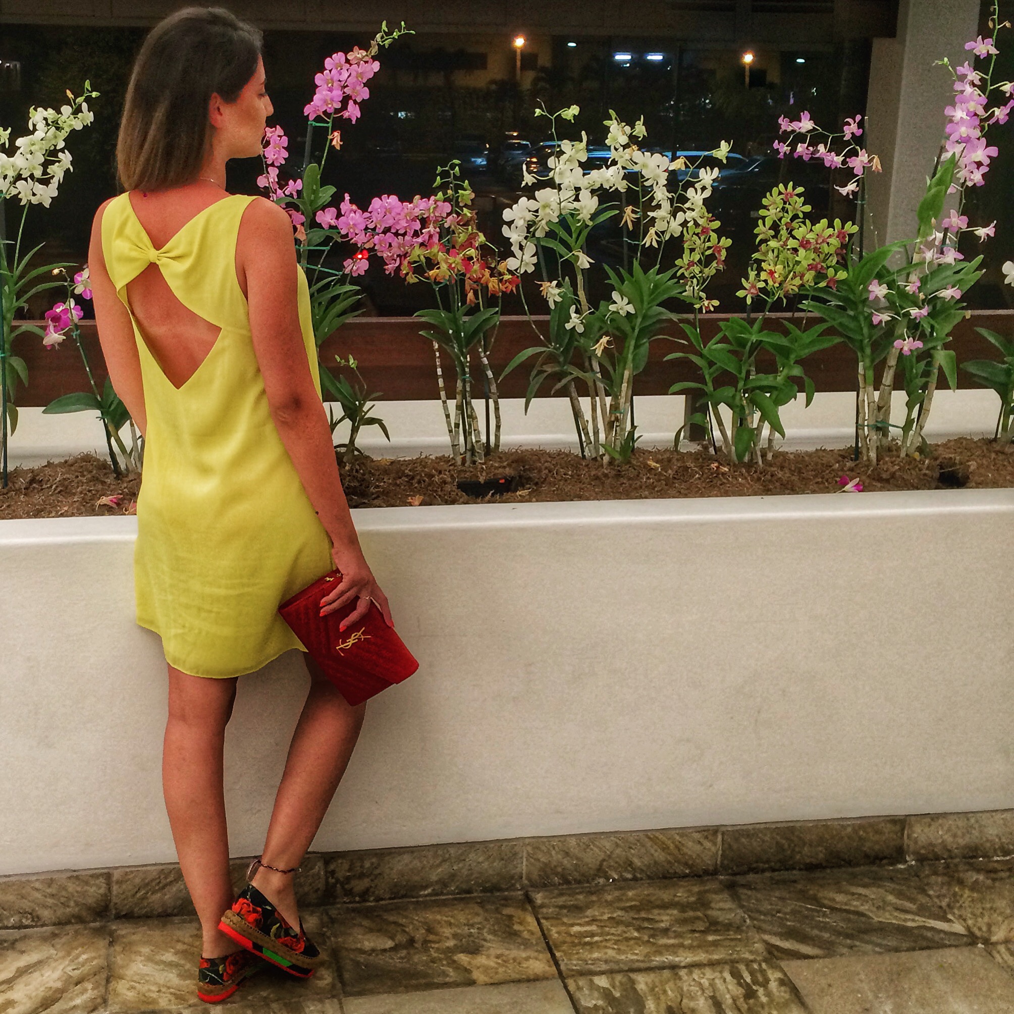 Sharing with you my first post of my beautiful trip to Hawaii. This casual Alice and Olivia open back bow dress is perfect after a tan. I’ve dressed it down with D&G floral espadrilles and a YSL wallet chain.