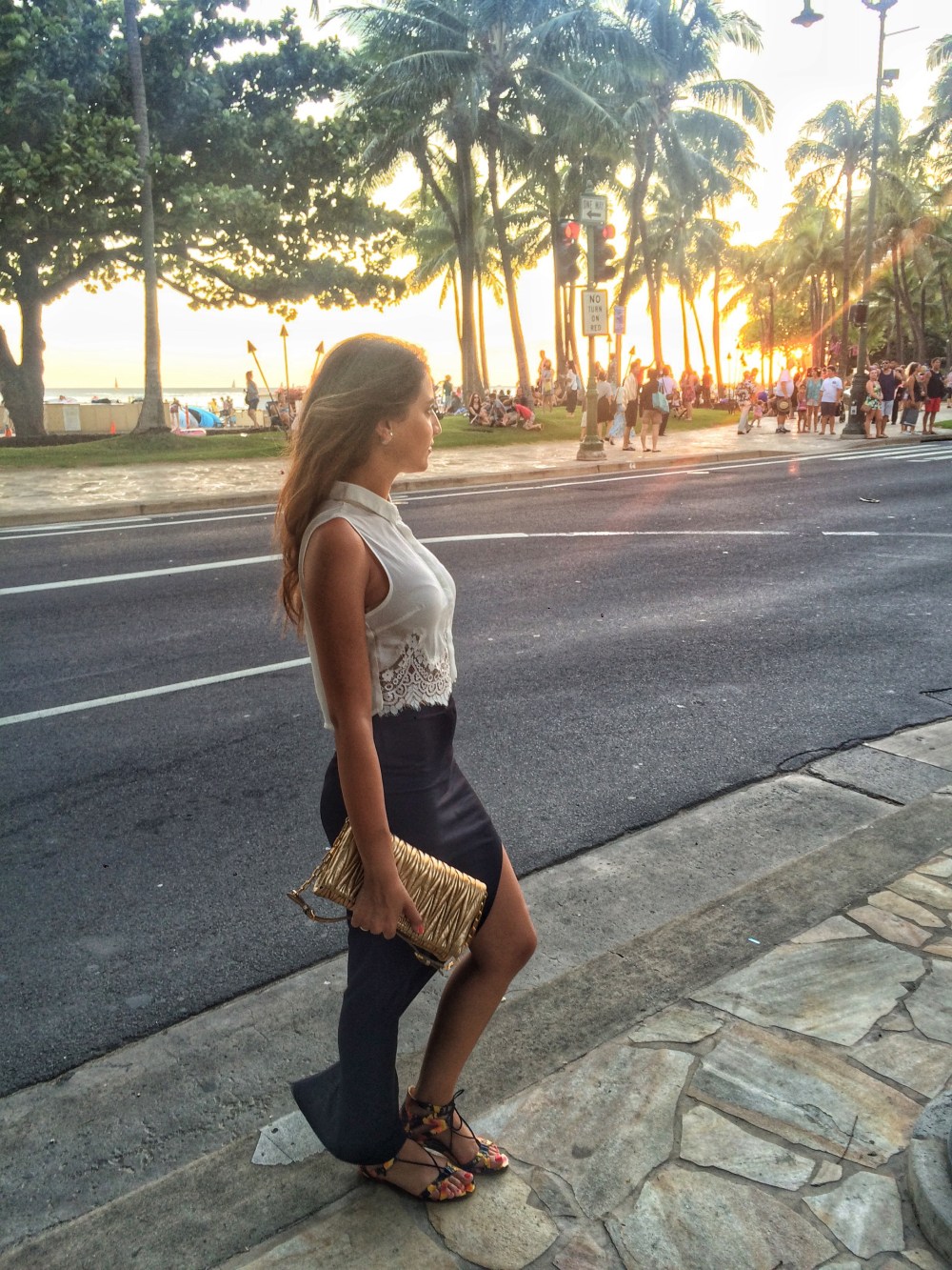 Walking on the Waikiki strip and watching the Hawaiian sunset in this B&W outfit. The side slit maxi skirt from Helmut Lang is a perfect match to this white crop top with lace details from Lush Clothing. A gold accent is brought up with the gold MiuMiu shoulder bag and clutch.