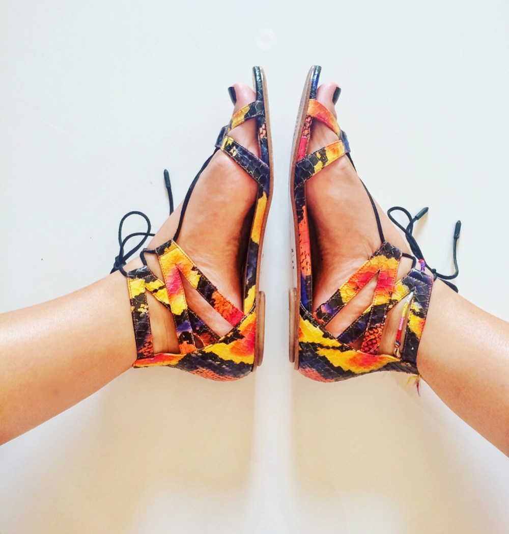 In contrast to the B&W outfit, I picked these Aquazurra multicolored snake sandals to make it more interesting.