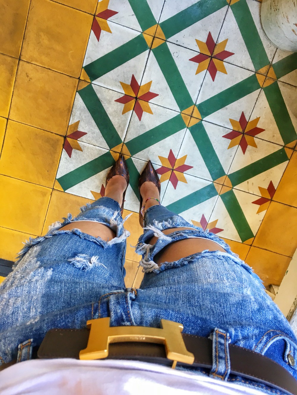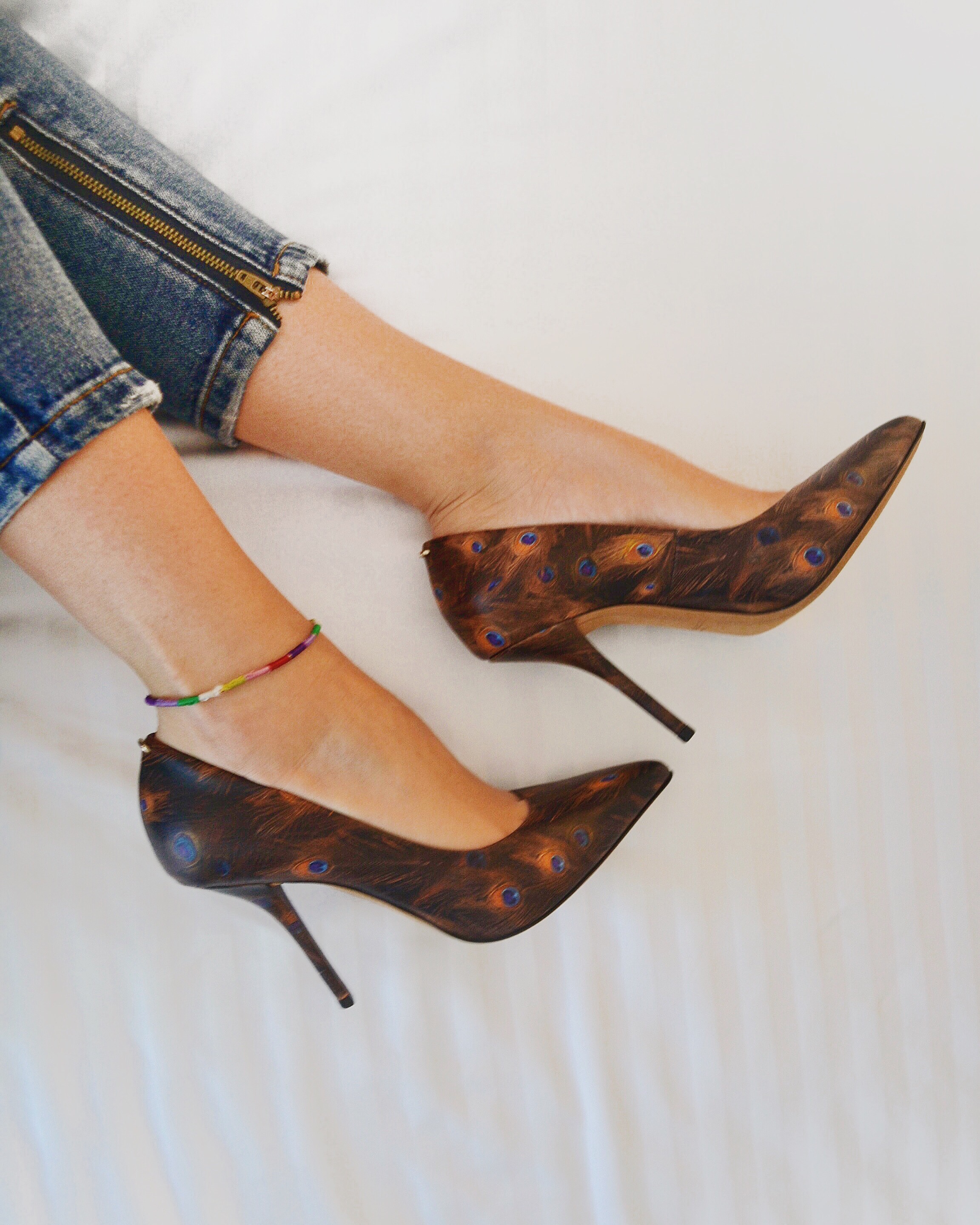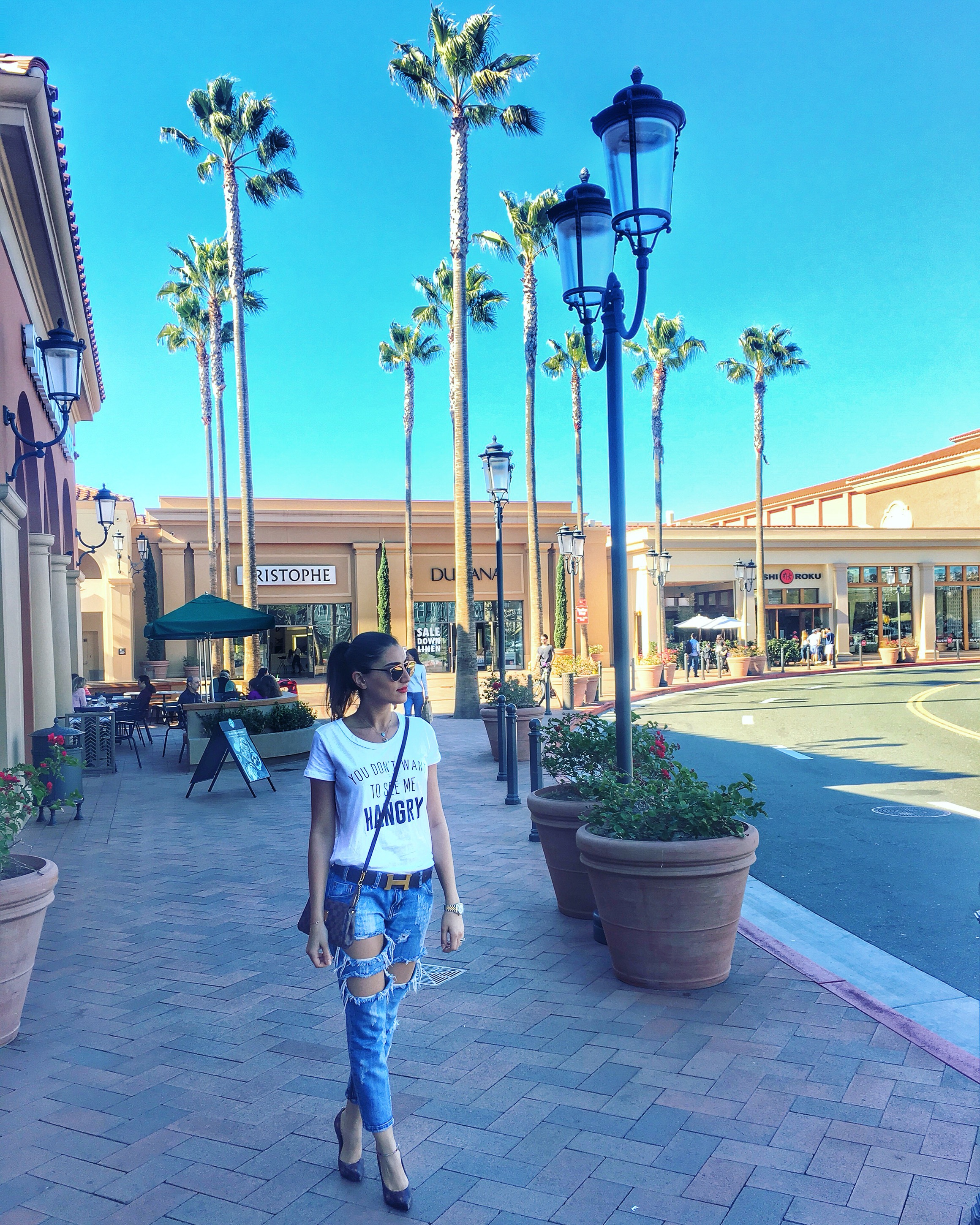Newport Beach, California– Saturday stroll in Fashion Island. The weather is beautiful and perfect for an outdoor walk. I am wearing these Givenchy Feather-Print leather pumps for the first time and they are super comfortable. They are from their classic collection in whimsical Peacock feather print which they also carry in sneakers, pouches, scarves, bags and clothing. In fact, you can have a whole outfit of that ;). I have dressed them down with the One Teaspoon “Trashed Freebirds” Jeans for more of a “day” look along with the H belt and and a Damier cross-body.