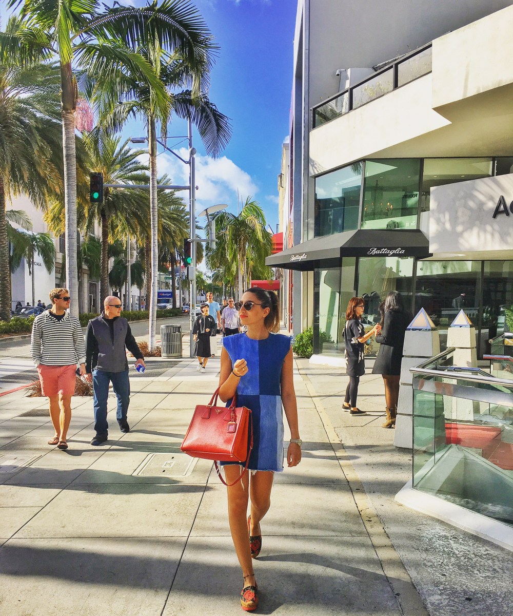 Beverly Hills– It’s a great sunny weekend to be outdoors, especially in Rodeo Drive. I opted for a casual and vintage style denim dress today. This After Party Vintage Patch Dress from NastyGal designed and manufactured in LA is made with reworked silhouettes and vintage fabrics making all their limited edition collection very unique! And because I’m a big fan of mixing and matching, I decided to add a little more colour to the outfit with the Dolce & Gabbana Rose Print Brocade Platform espadrilles and this red and orange Prada Saffiano. These wedge floral heels are super comfortable and versatile, you can easily style them with different outfits.