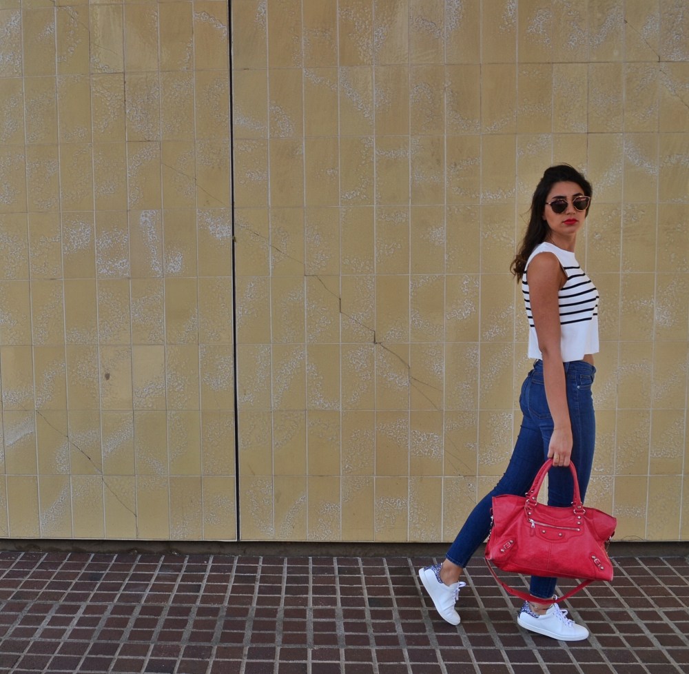 Dressed in a crop top and denim with a Balenciaga Part-time, it’s all about the trainers today. And the Sneaker Style trend continues with my favorite pair of Maje Fanny Leather Sneakers. The glitter detailing at the heel gives them an unexpected and unique twist: this is when a classic pair of sneakers gets a makeover. I find these trainers ideal with a cropped pair of jeans or even a long skirt.