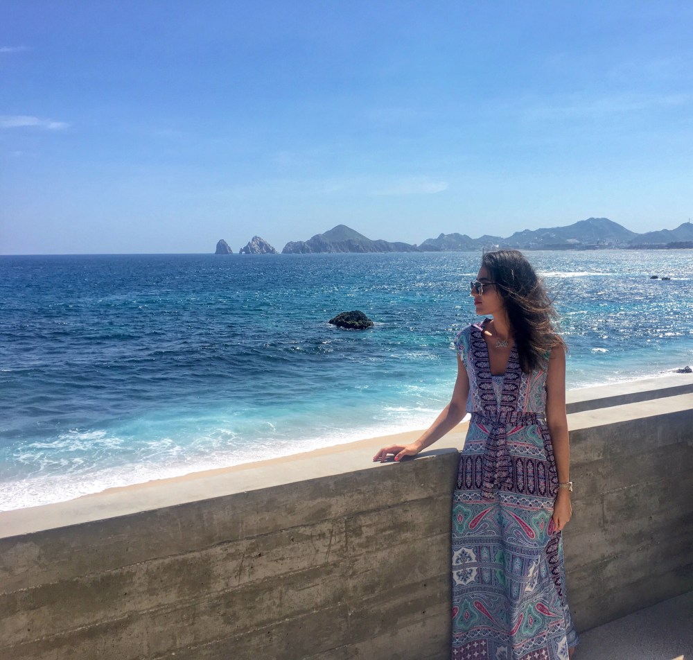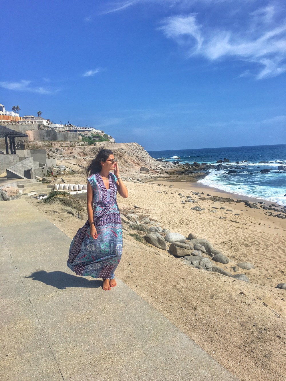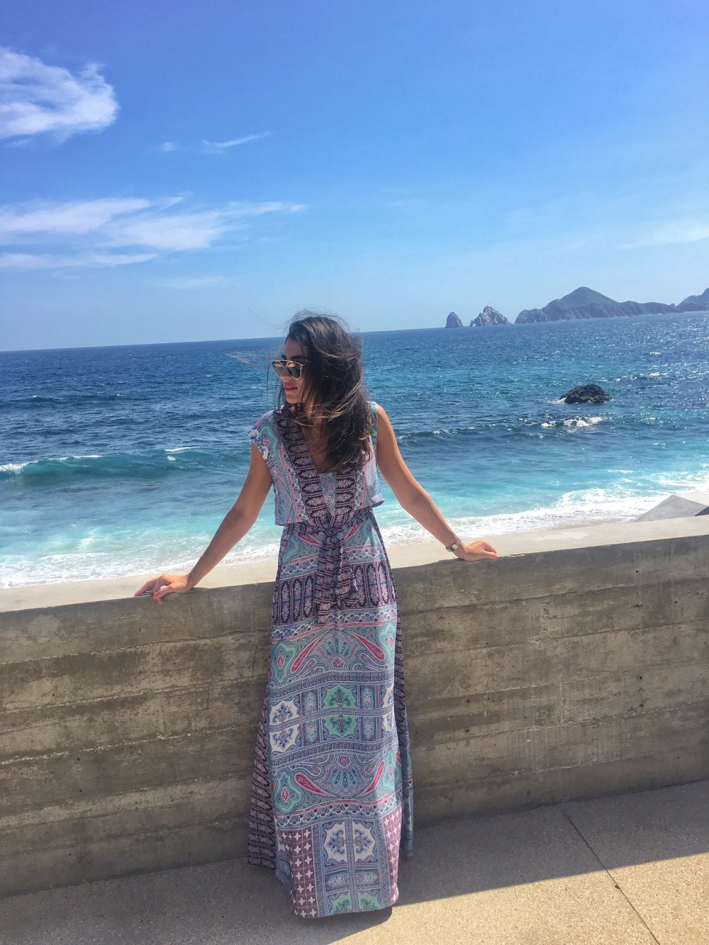Cabo San Lucas– A stroll by the beach today enjoying all the shades of blue this city has to offer. Wearing a long prints front tie dress from BCBG. What I really love about this dress is the cut-out that gives the impression that it’s a crop top paired with a long skirt. And who’s to say if prints will ever go out of style!