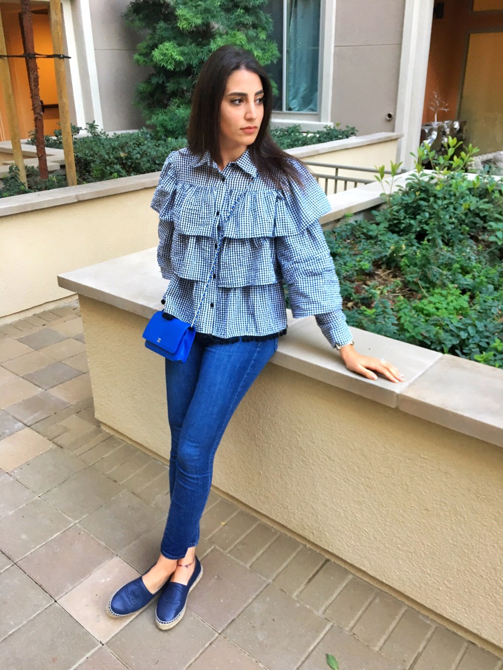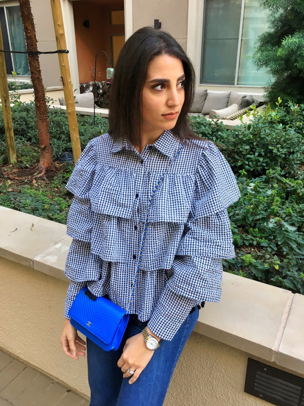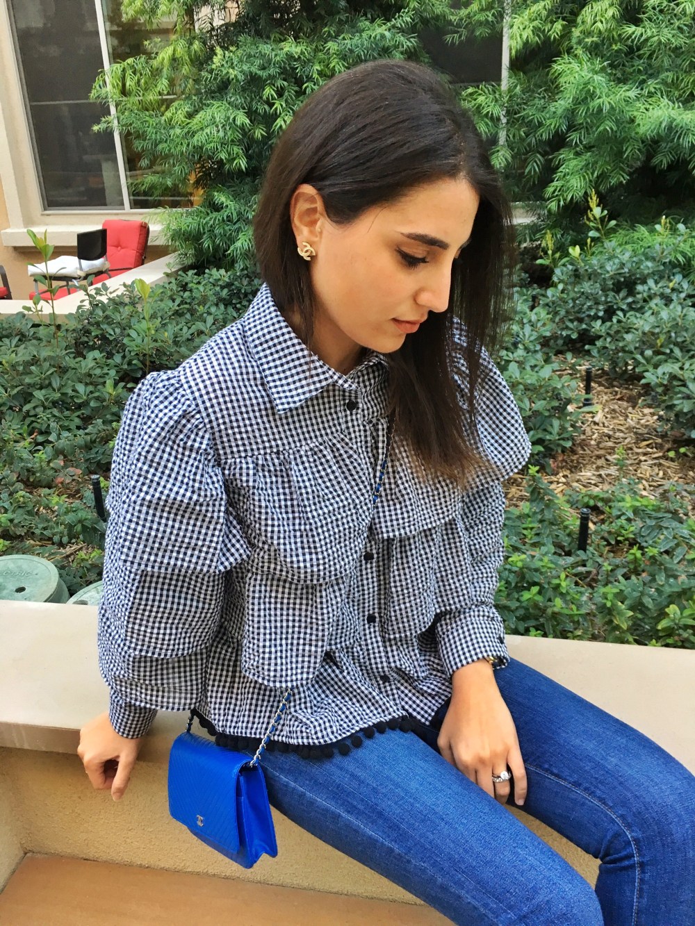 Today’s blouse is all about layers and statement ruffle sleeves. Wearing a b&w gingham top from SheIn. Find out more about this blouse here: goo.gl/evgtKy. I always like pairing gingham with denim, I love that combination.