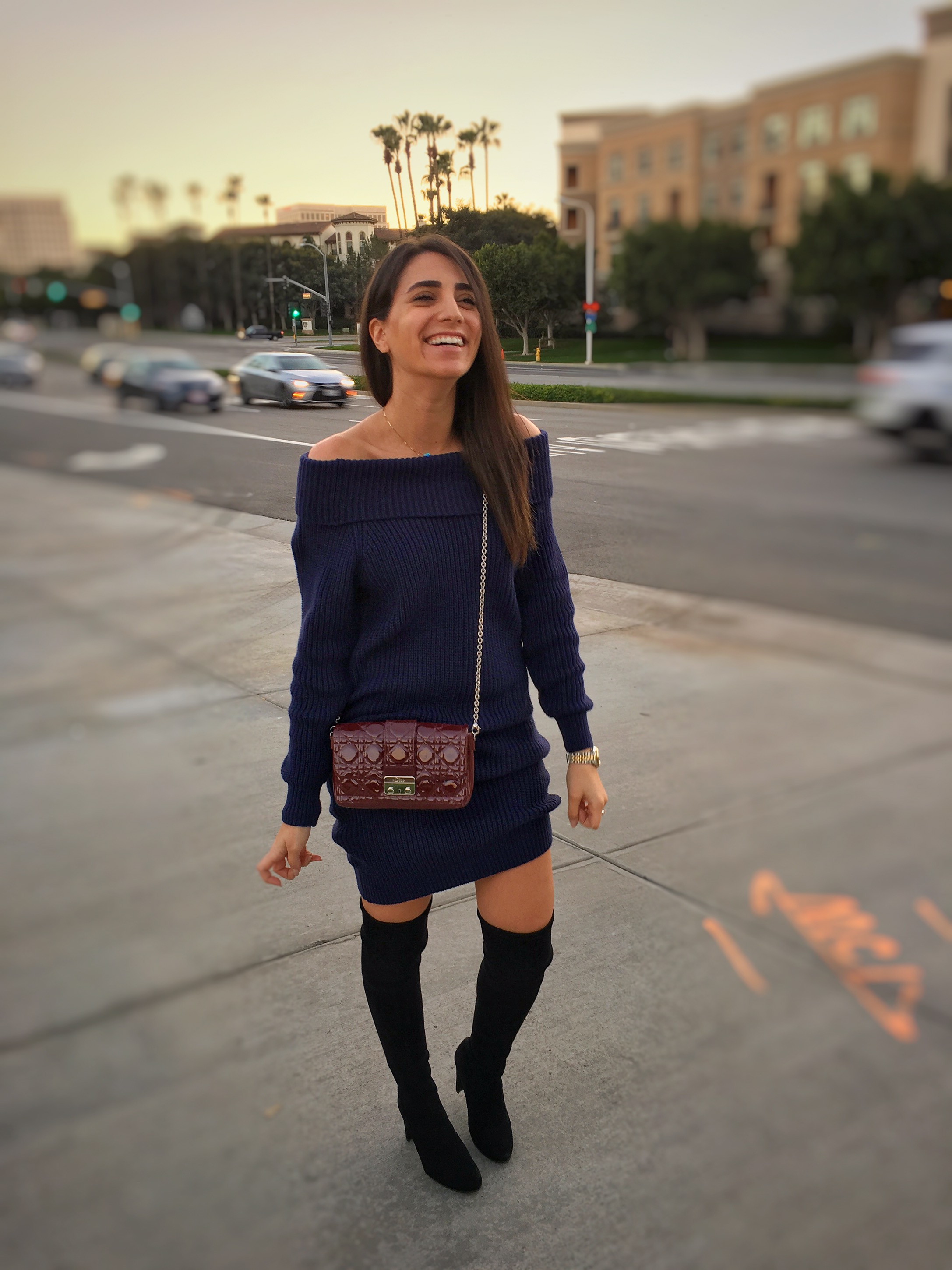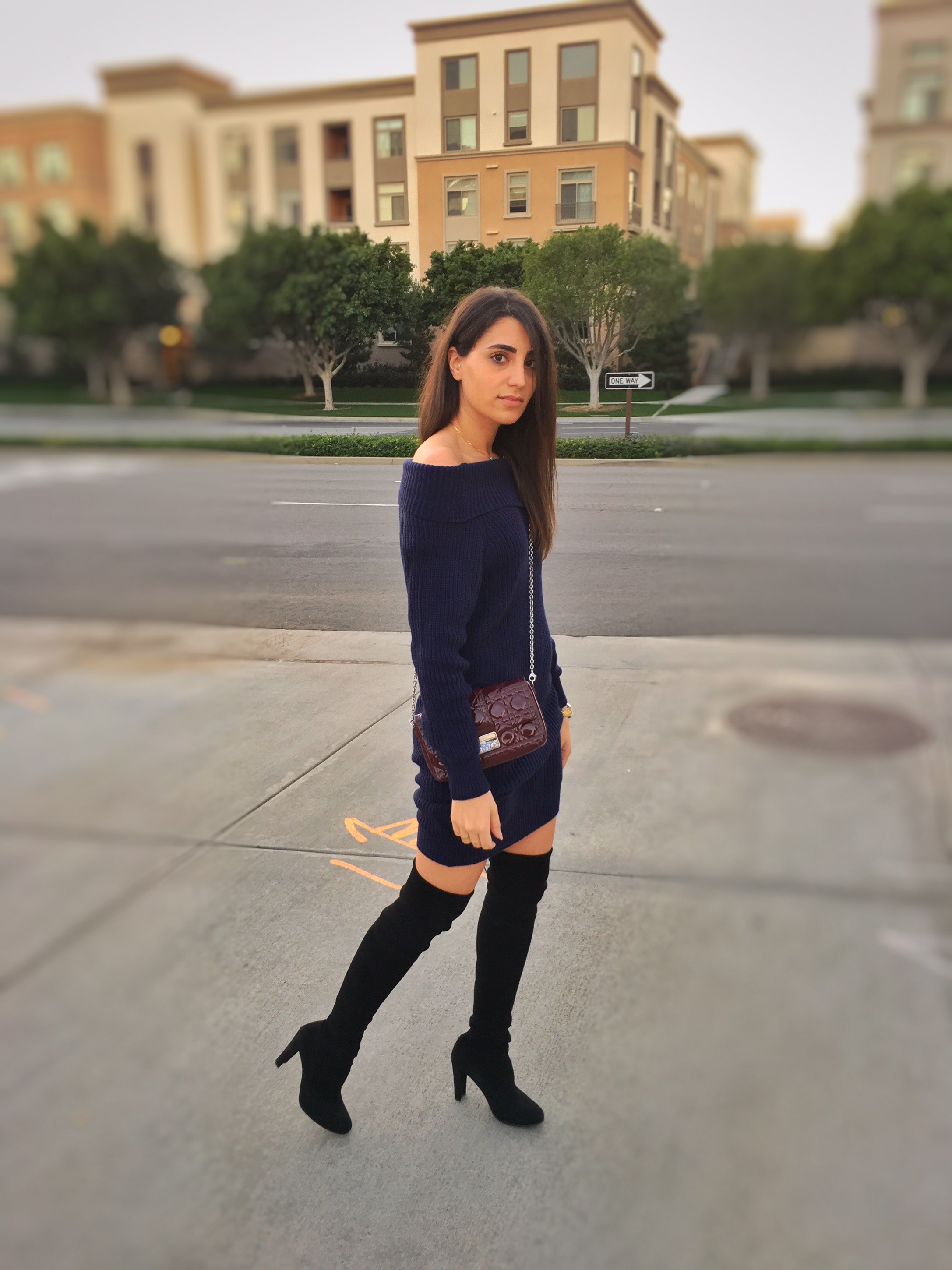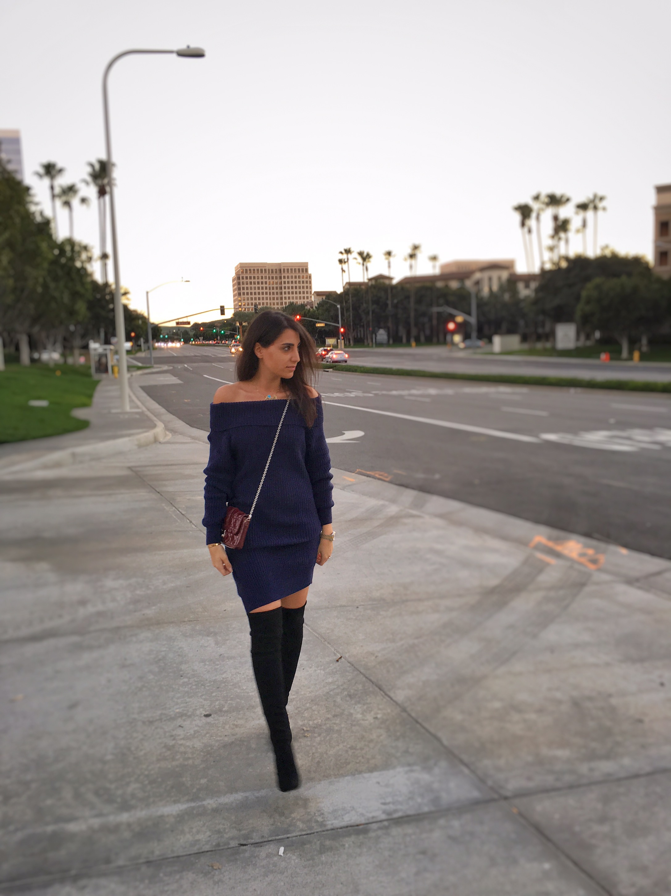 Off-shoulder dresses and tops have been trending for the past seasons and so have sweater dresses. Combining both together is definitely interesting. I am wearing a favorite from SheIn, an off-shoulder sweater dress super cozy and perfect for these last winter California days. Learn more about it in the following link: goo.gl/ve2V1T. The nice thing about the sweater dress is that it’s so versatile you can practically wear it with anything and it will look great. There is also the option of clinching the waist with a clunky belt to give it some shape. You can either dress it down with white sneakers or dress is up with a pair of boots like this one. I find that these suede knee-high boots from Stuart Weitzman in Highland complement the outfit perfectly.