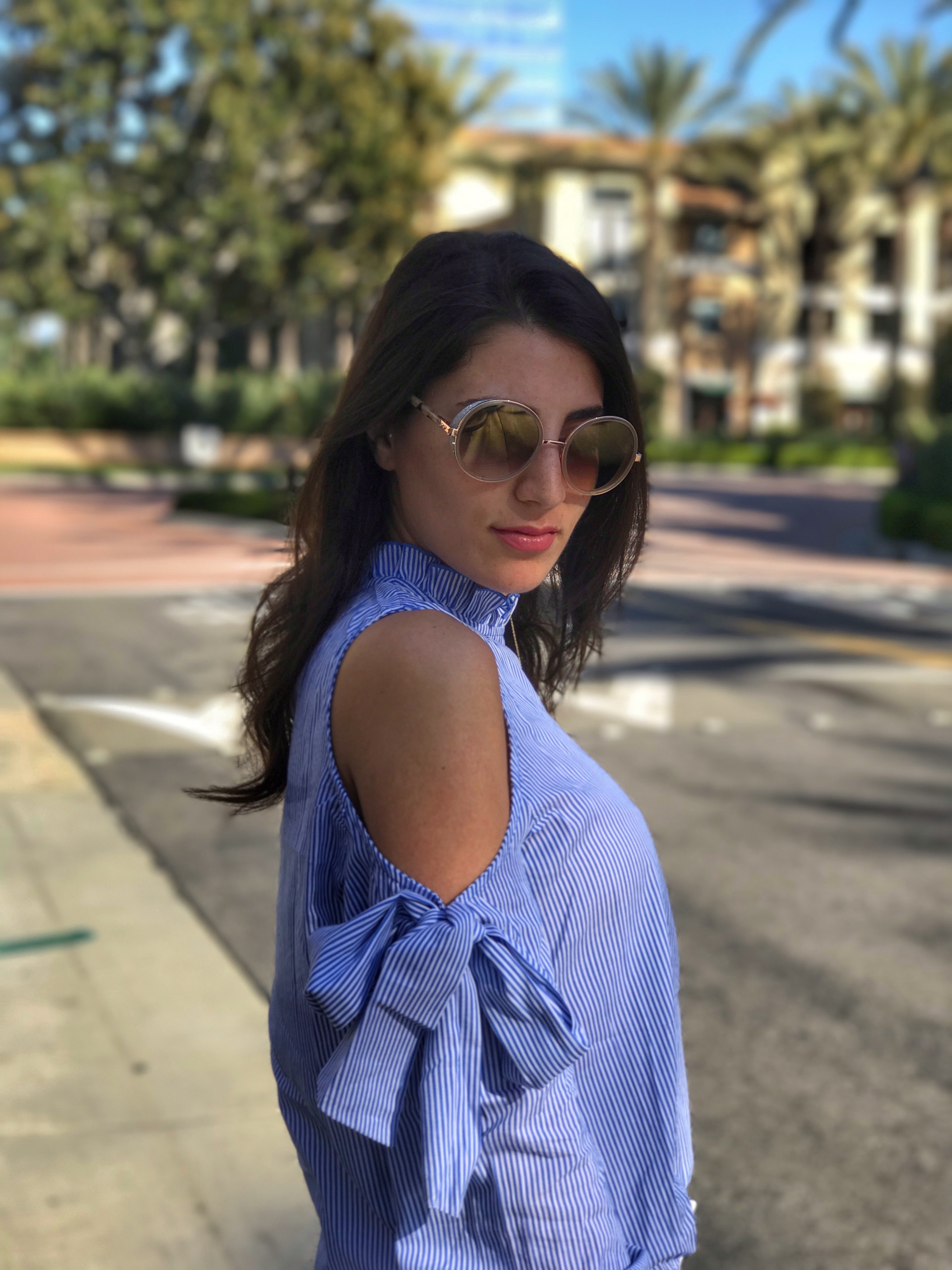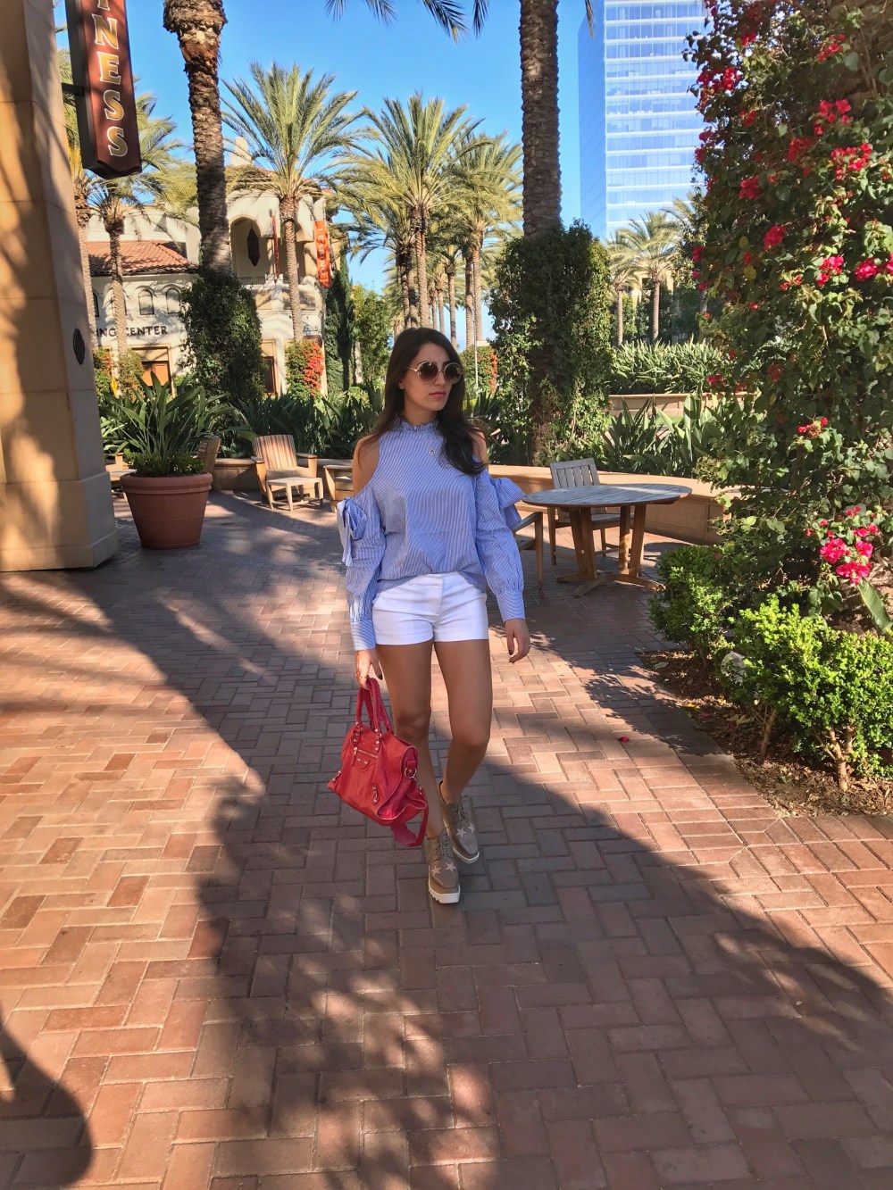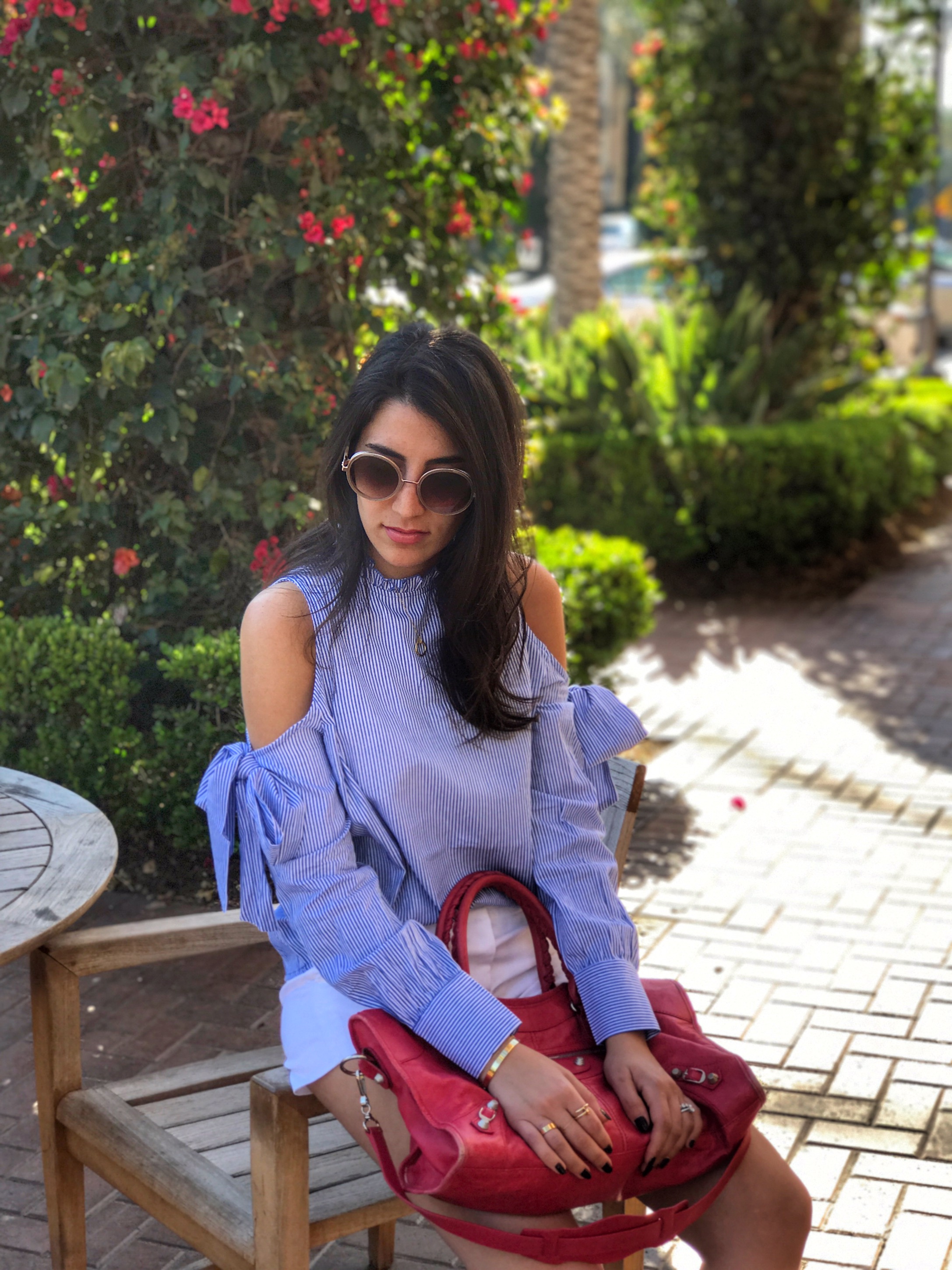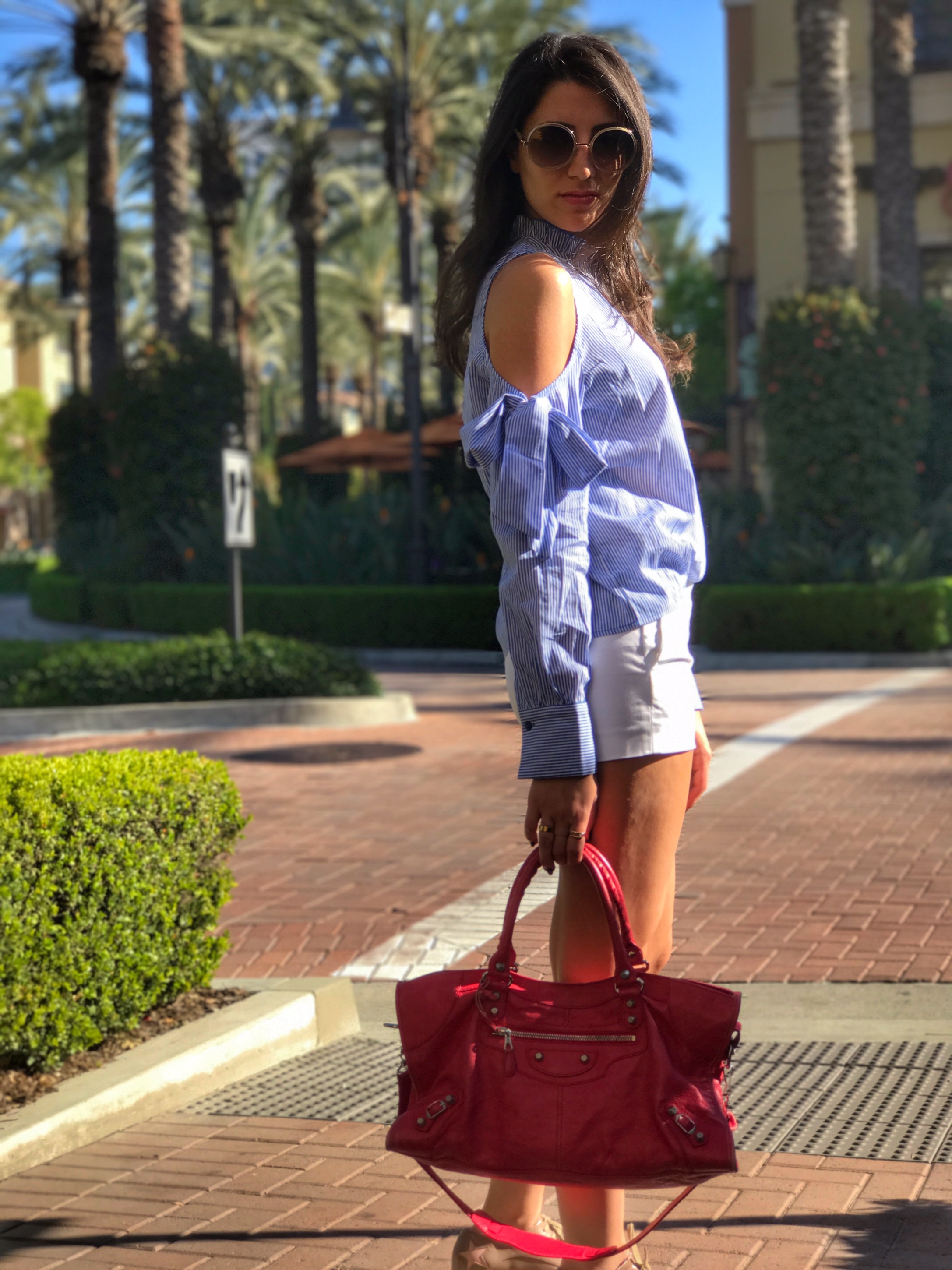 Today, I am wearing a striped cold shoulder blouse from SheIn. Find out more about this beautiful top here: goo.gl/cZqCBJ. I love the detailing of the ruffled neckline and bow sleeves. Paired this with Michael Kors shorts, Stella McCartney brogues, Balenciaga part-timer and Jimmy Choo sunnies.