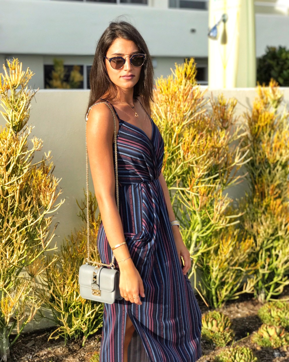 I am also wearing Dior sunnies and a grey Valentino leather rockstud strap cross-body bag. This color has been very practical and easy to match, definitely a good one to add to my wardrobe. Also wearing Hermès Oran sandals in patent leather (color: carmin). Buy it here: http://usa.hermes.com/woman/shoes/sandals/oran-17256.html?color_hermes=CARMIN&nuance=1.