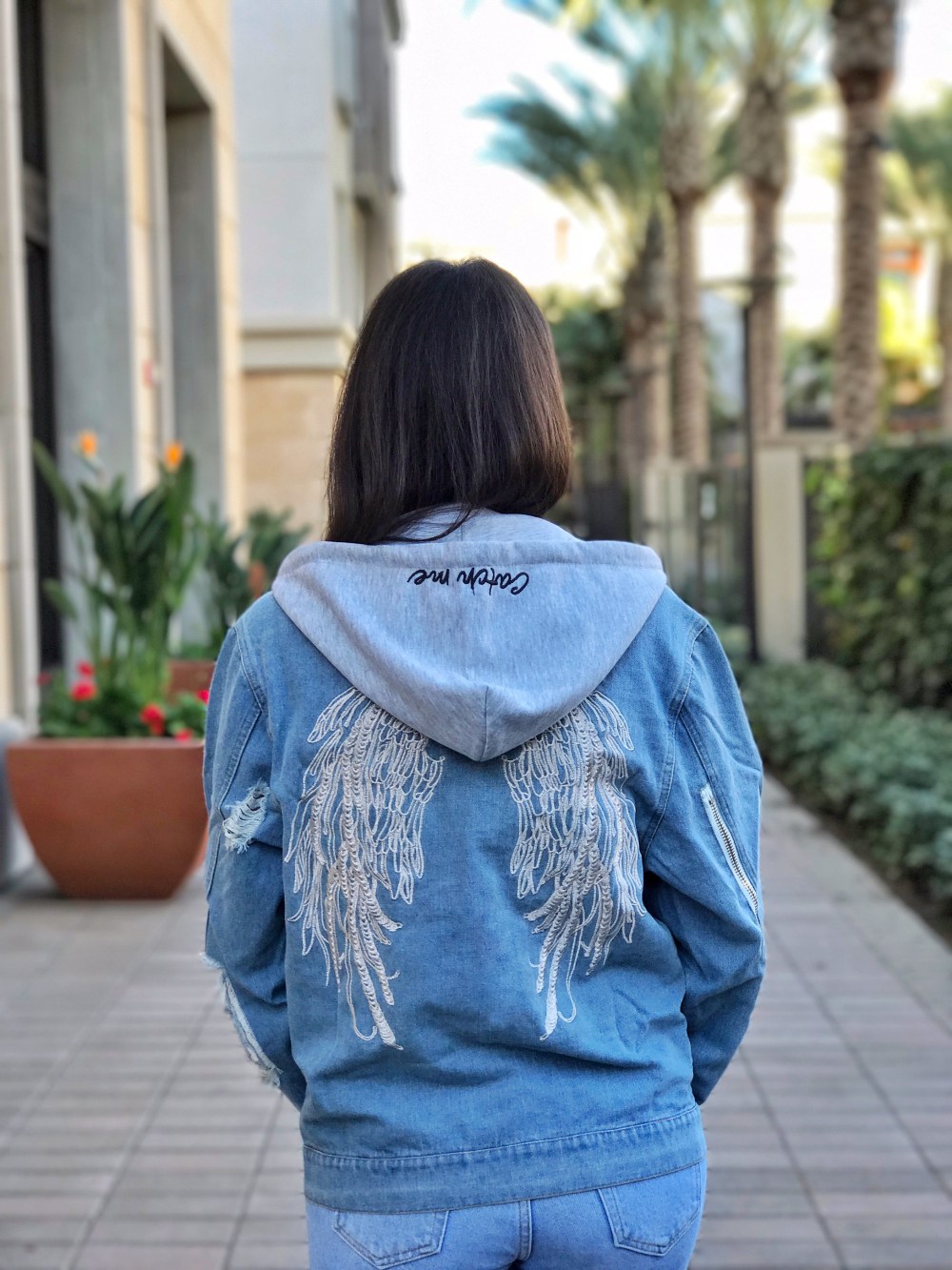 Statement jackets are always the perfect piece to make an outfit complete. What better way to represent the City of Angels than with this oversized wings embroidered denim jacket. The detachable hoodie, ripped detailing and zipper sleeve are what makes this SheIn jacket so unique: Catch me if you can..