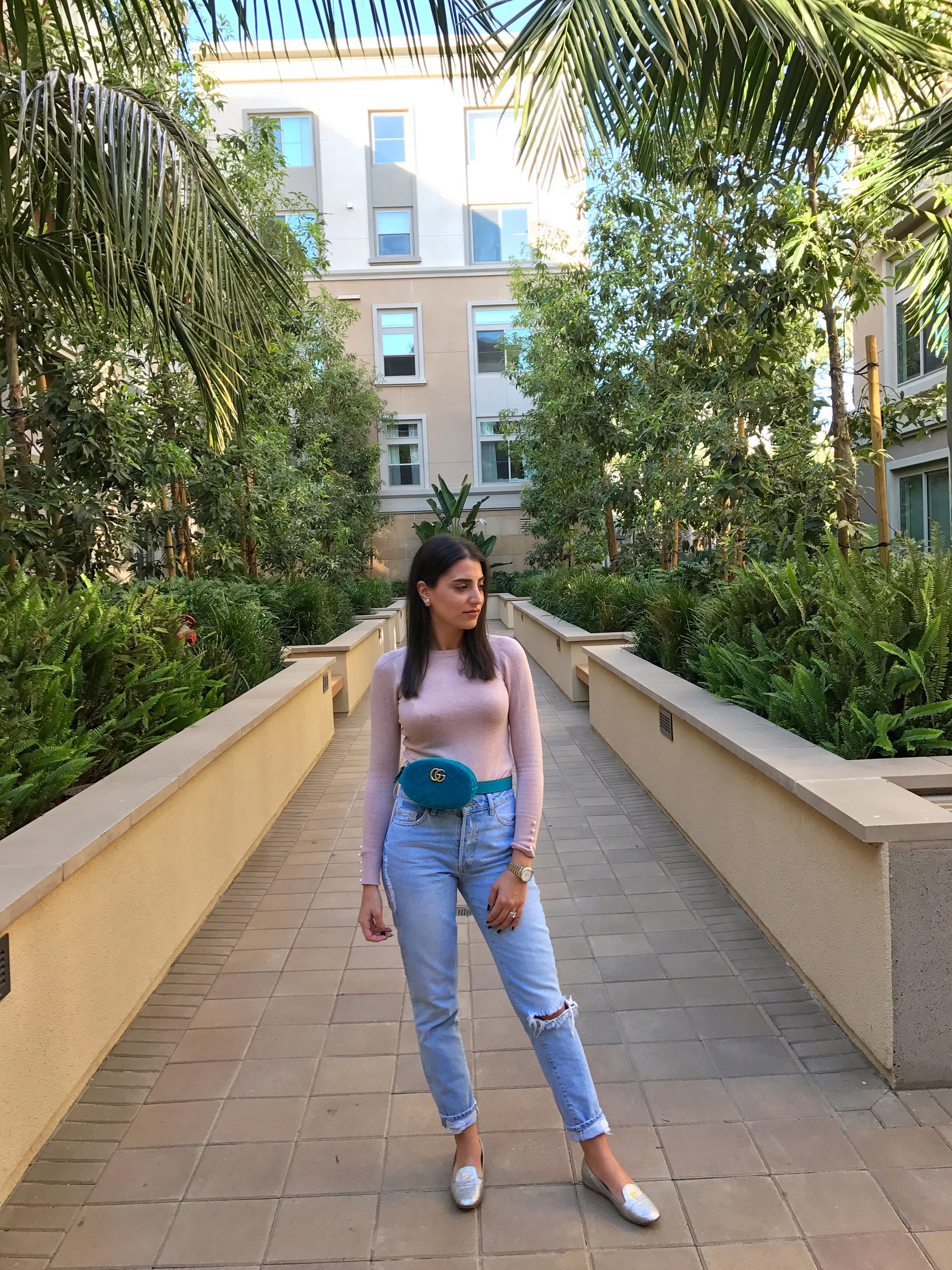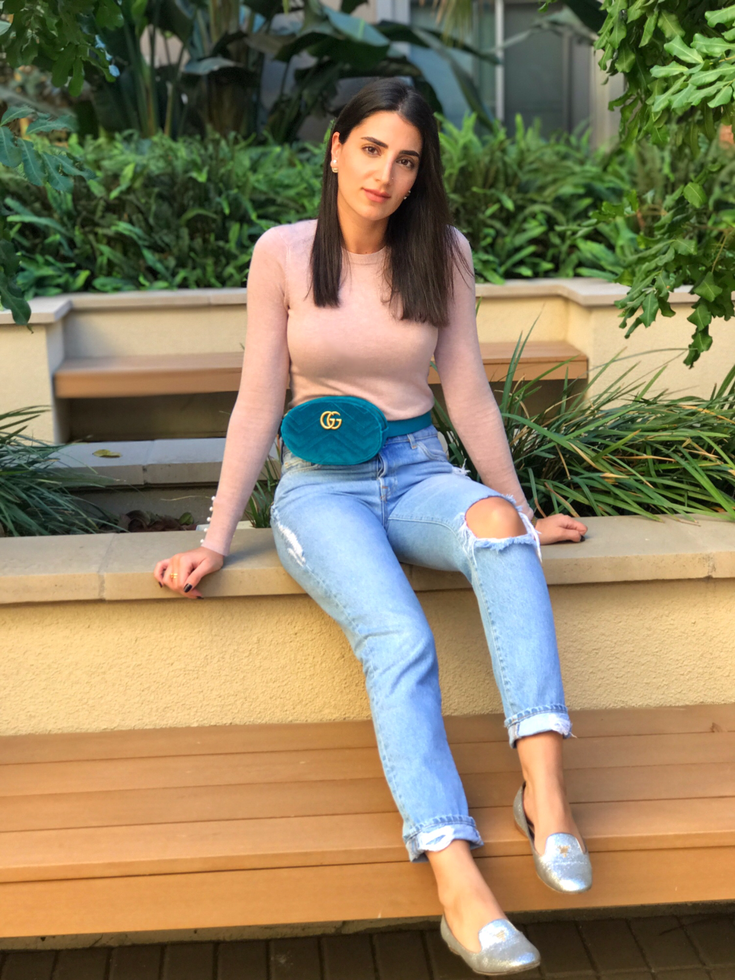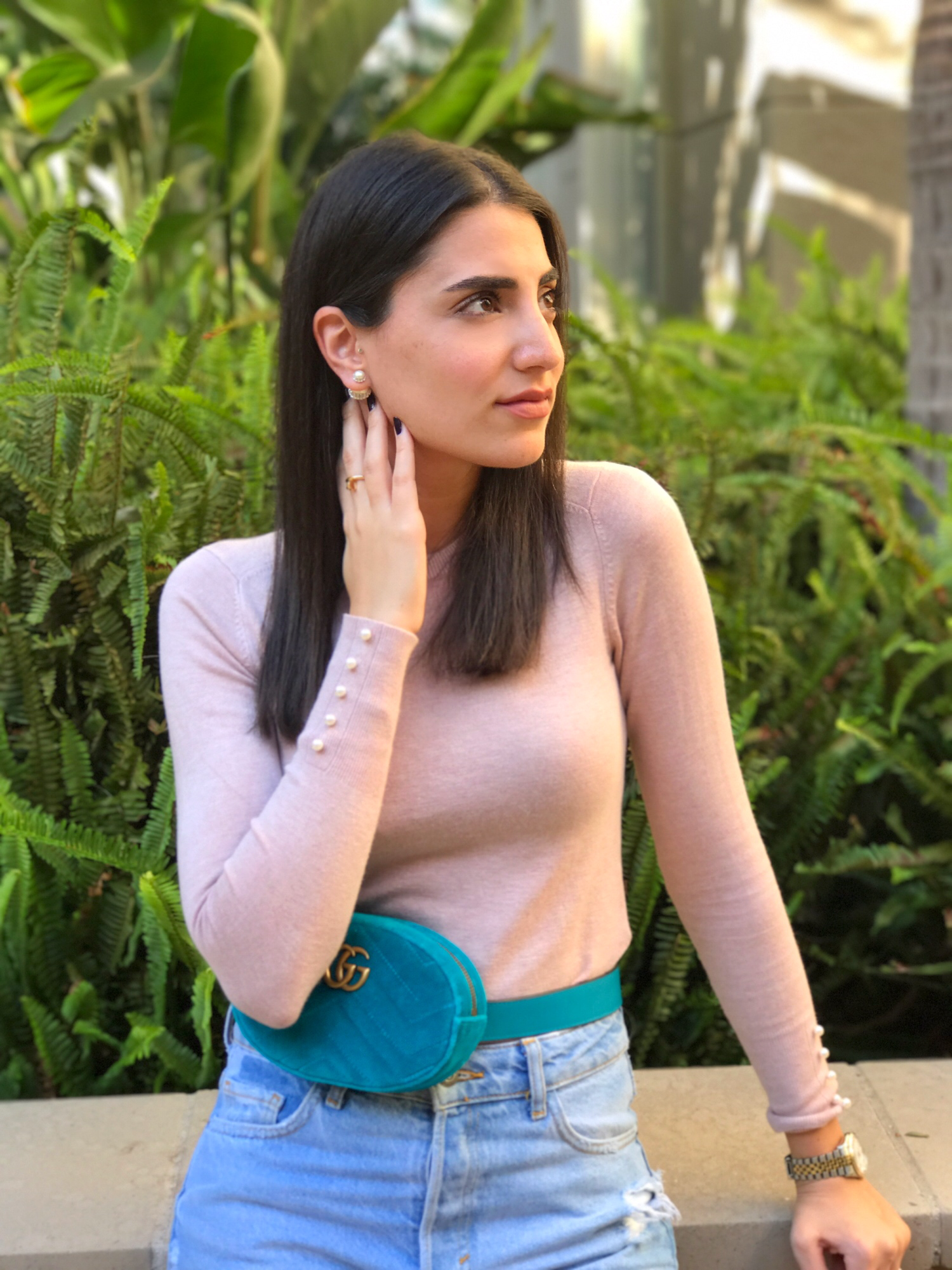 Pearls, the classic jewelry staple, are back and trending not only on accessories but also on clothes and shoes. This traditional style of jewelry is being used as a statement detail giving the outfit an edgier look. I’m wearing a full Zara outfit: knit sweater with pearly cuffs and high-rise boyfriend jeans. Accessorized the outfit with Dior pearl tribal earrings, GG matelassé velvet belt bag and Prada glitter flat.