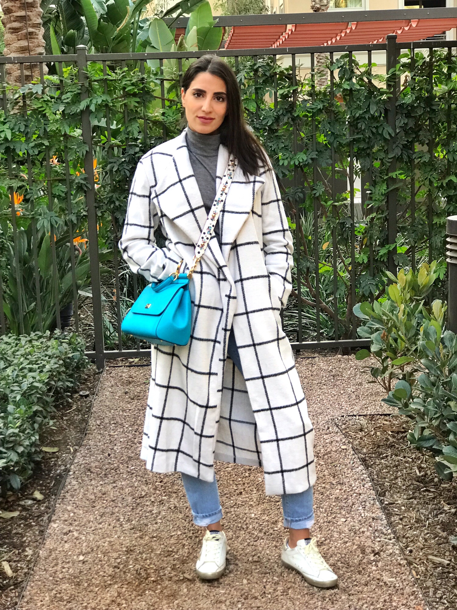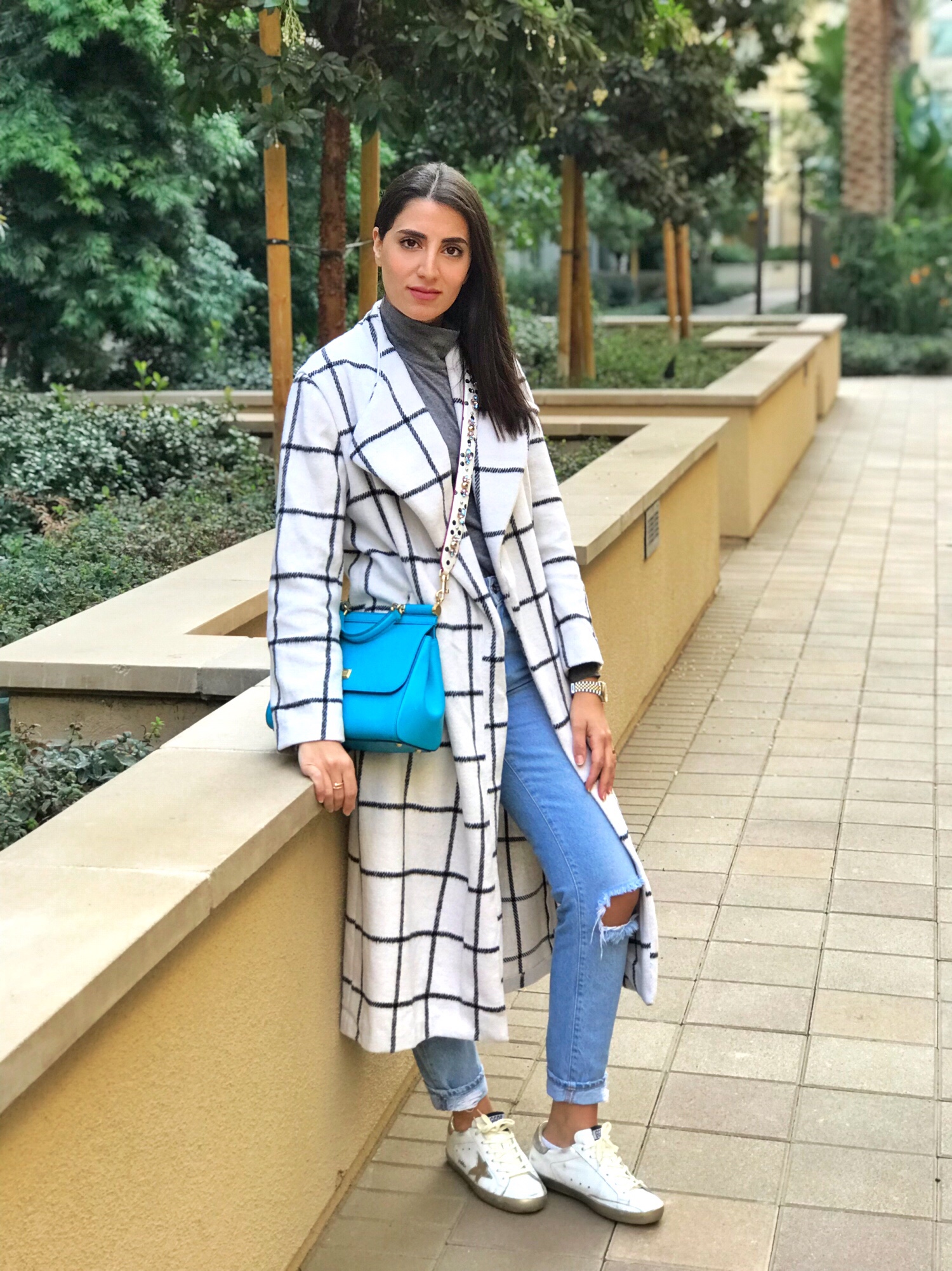 I am wearing a drape collar grid longline coat from SheIn. This coat is super comfortable, cozy and perfect for a street style look. Check it out below for more information. I love layering a longline coat with a simple turtleneck. The grid already makes it busy enough I feel anything underneath it should be minimalist. I have paired this Zara turtleneck with ripped boyfriend jeans. The blue handbag gives the outfit a pop of color and I absolutely love my recent addition to this handbag: this polka dot pattern strap with crystal embellishments.