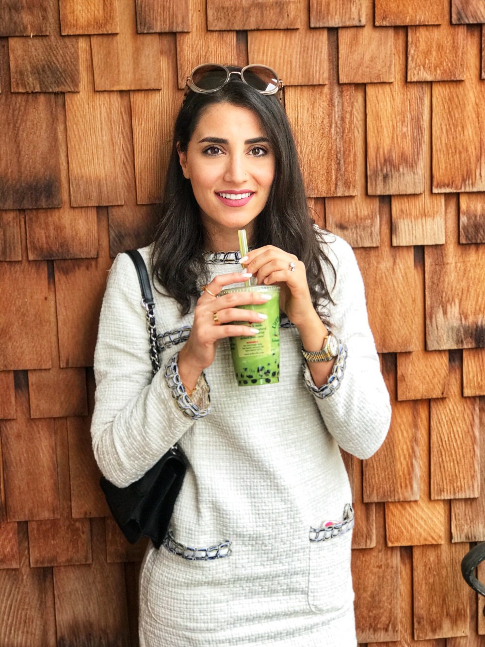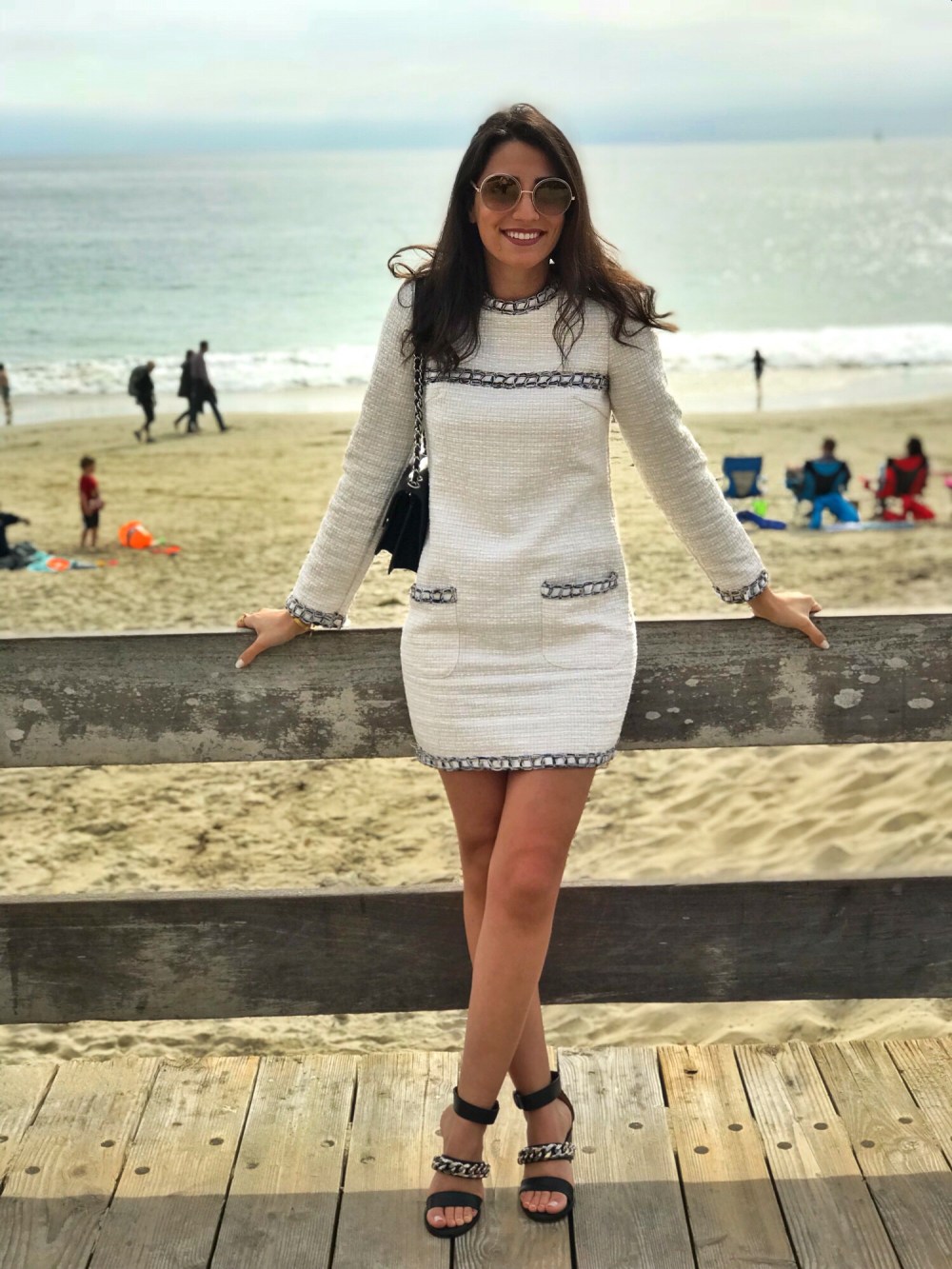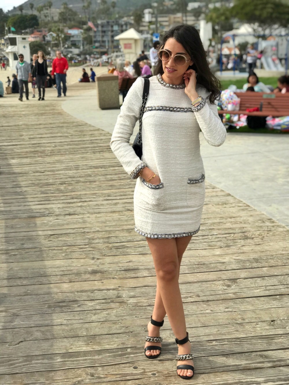 Tweed, an old favorite continues to be a major closet staple this season. This prominent, sturdy structure from matching sets to oversized jackets is known for its chic and elegant look and versatility. I am dressed in a whipstitch trim tweed dress from SheIn. Find out more about the dress in the link below. I am wearing Givenchy chain block heel sandals and Chanel handbag. I like how the chains on both match the whipstitch trim detailing in the dress.