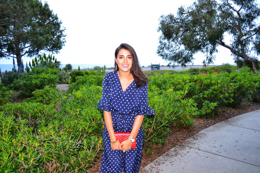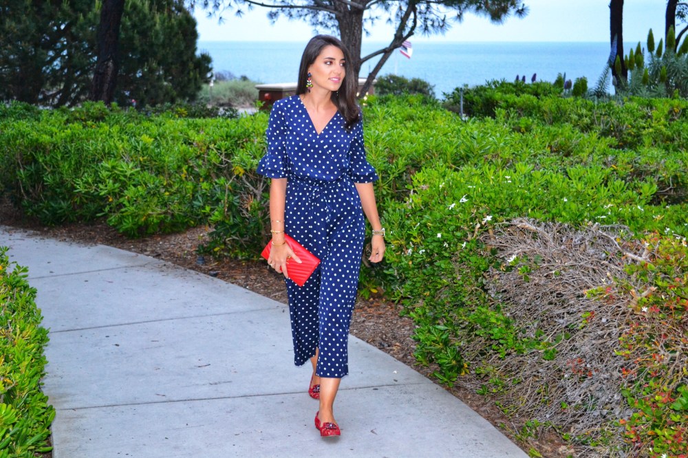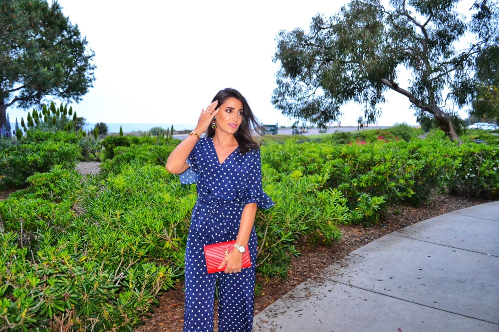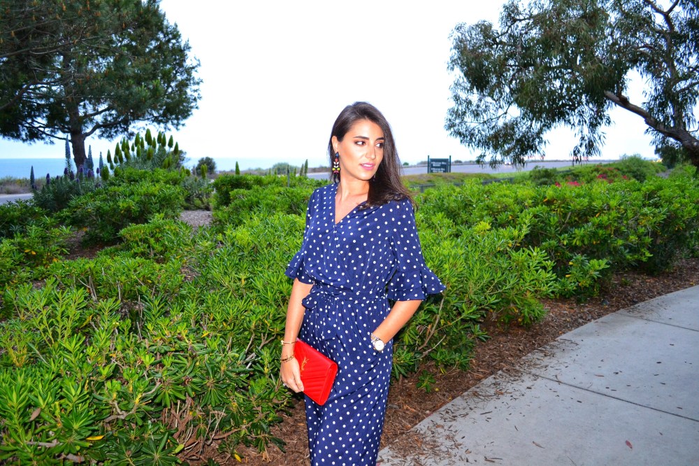 Newport beach– We spotted the polka dot trend in the Spring 2018 runways all the way from statement sleeve tops and evening dresses to heels and swimwear. This playful trend is a great way to transition your wardrobe into Spring taking it from day to night. I am wearing a tiered surplice wrap jumpsuit from SheIn, very comfortable and easy to wear. The jumpsuit also has a detail that I’ve been very much into lately which is ruffles. The trumpet ruffle sleeves bring a nice twist to the popular bell sleeves we’ve been seeing everywhere. For a pop of color, I’ve added to the look a red YSL woc and Dolce & Gabbana lace slippers.