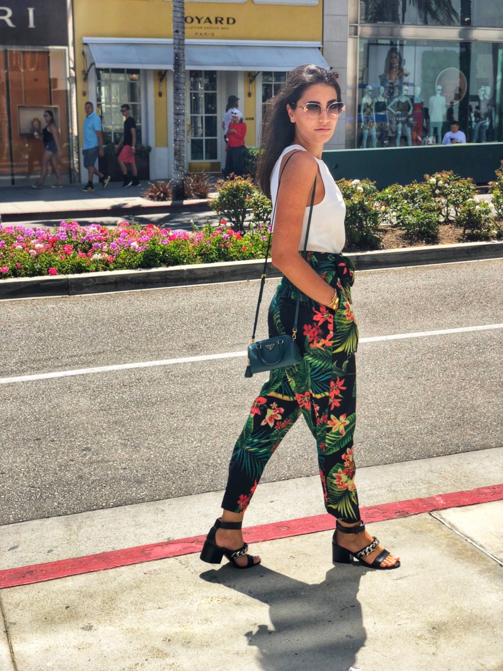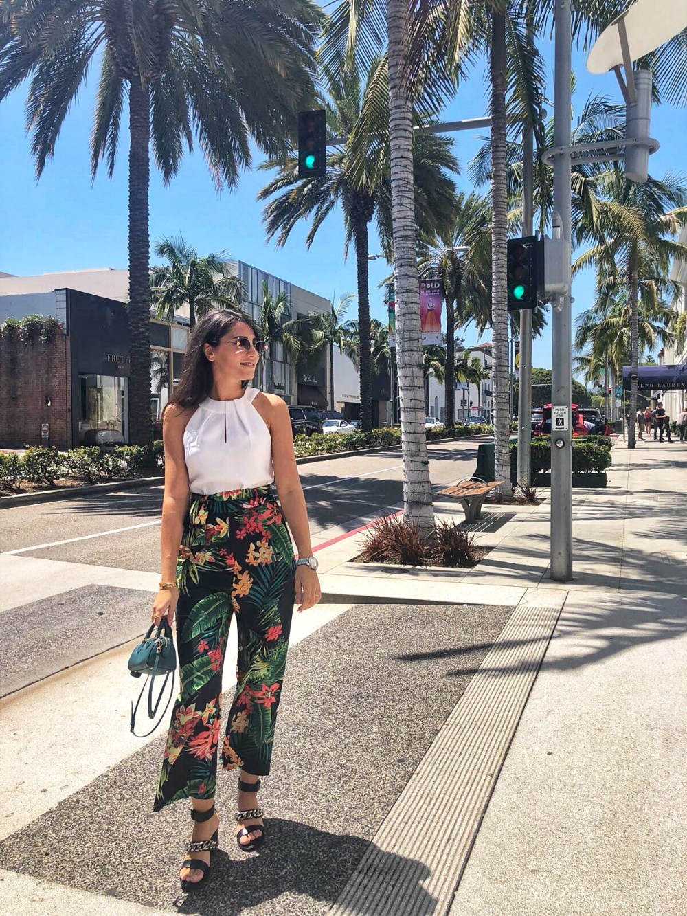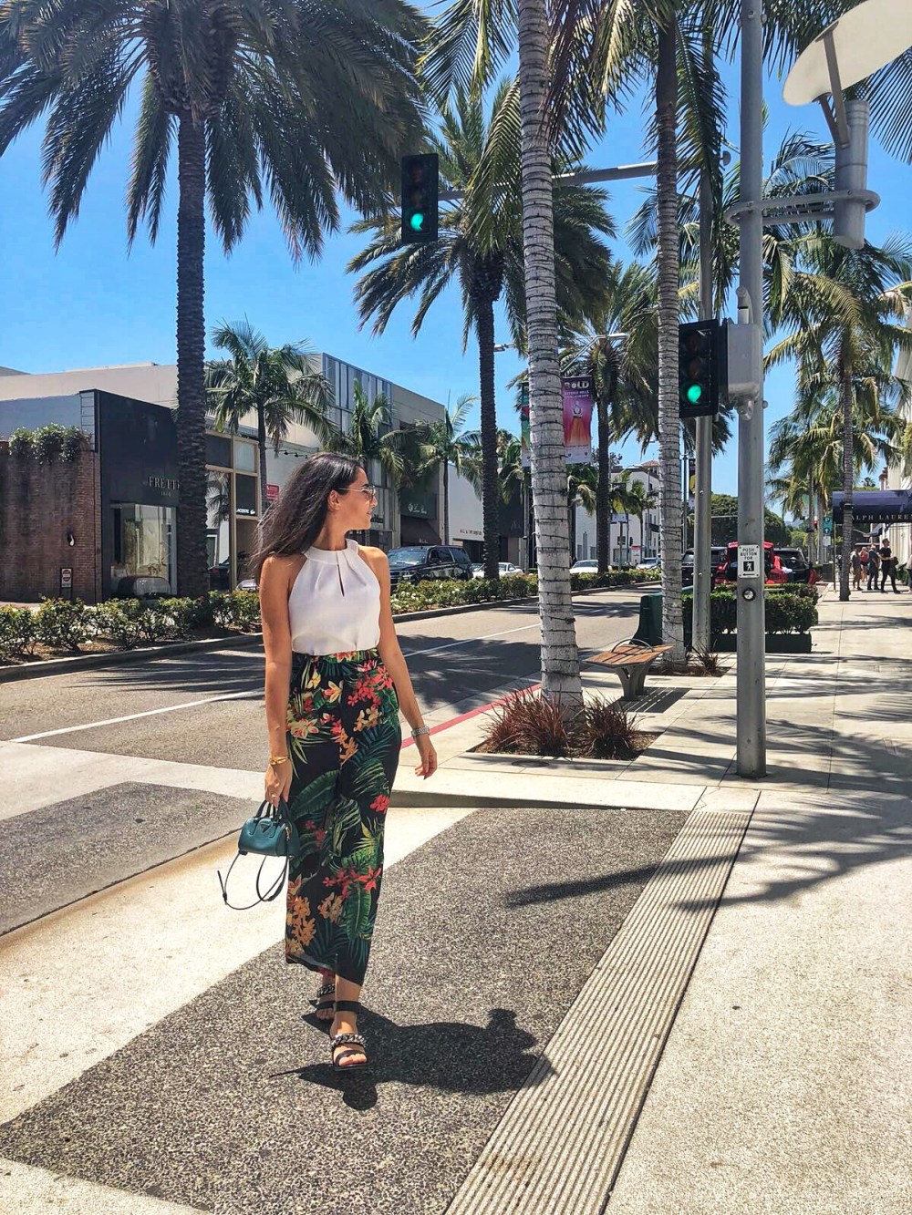 What a fun way to embrace summer than with the fresh feeling of floral prints. The season’s florals are reflected in soft pastel colours and also vibrant hues, all part of a beautiful garden theme. I am wearing tropical prints pants from SheIn. These tie waist wide leg pants are a perfect way to welcome the first days of summer. I have paired them with a halter neck white top from Ted Baker and Givenchy chain strap block heels, making it an edgier look.