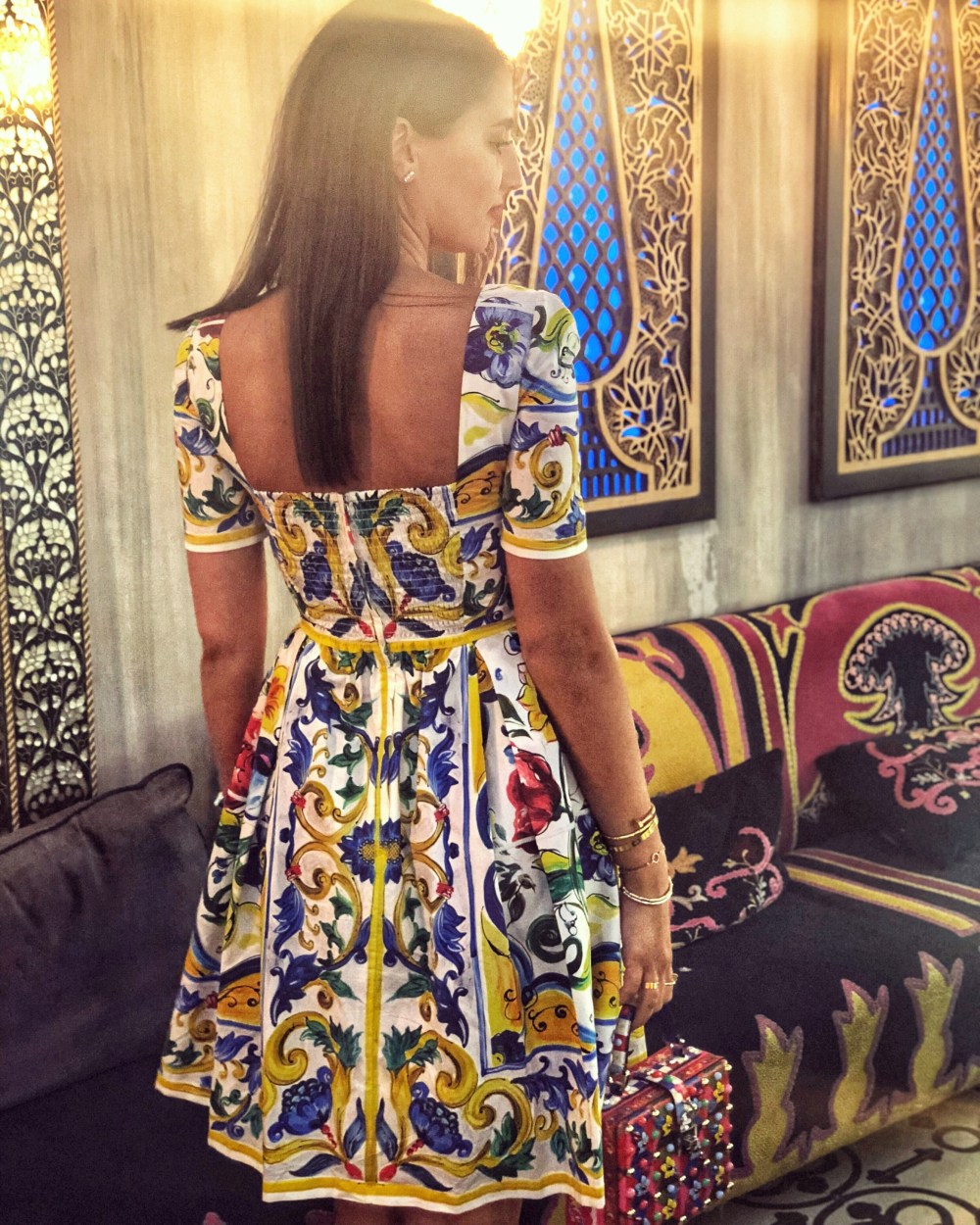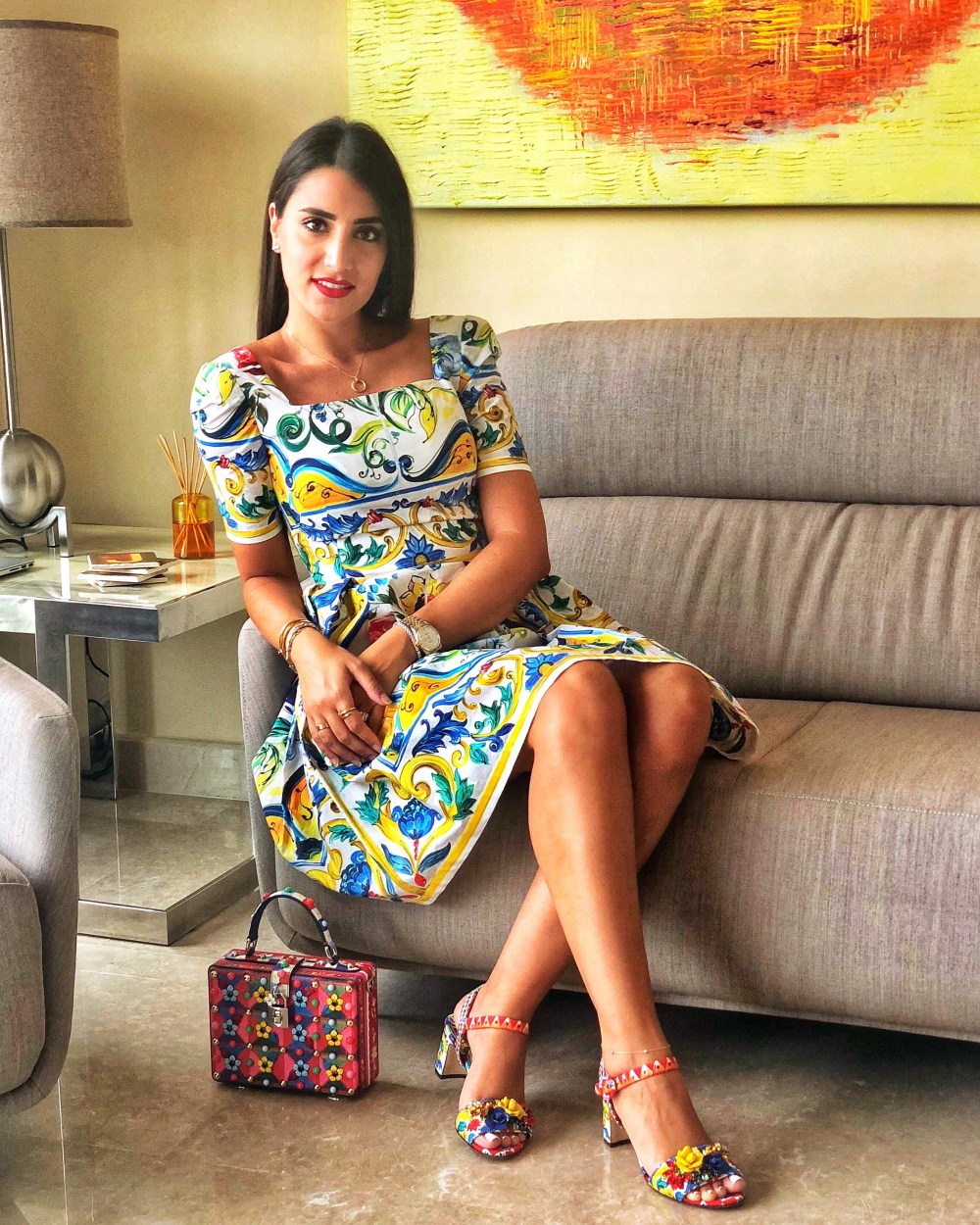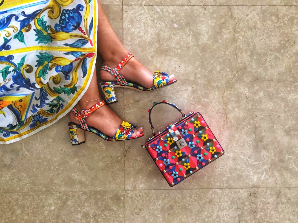 Who else is obsessed with D&G prints? Wearing a Dolce and Gabbana full outfit: a Majolica print dress and brocade sandals and a Dauphine print box bag.