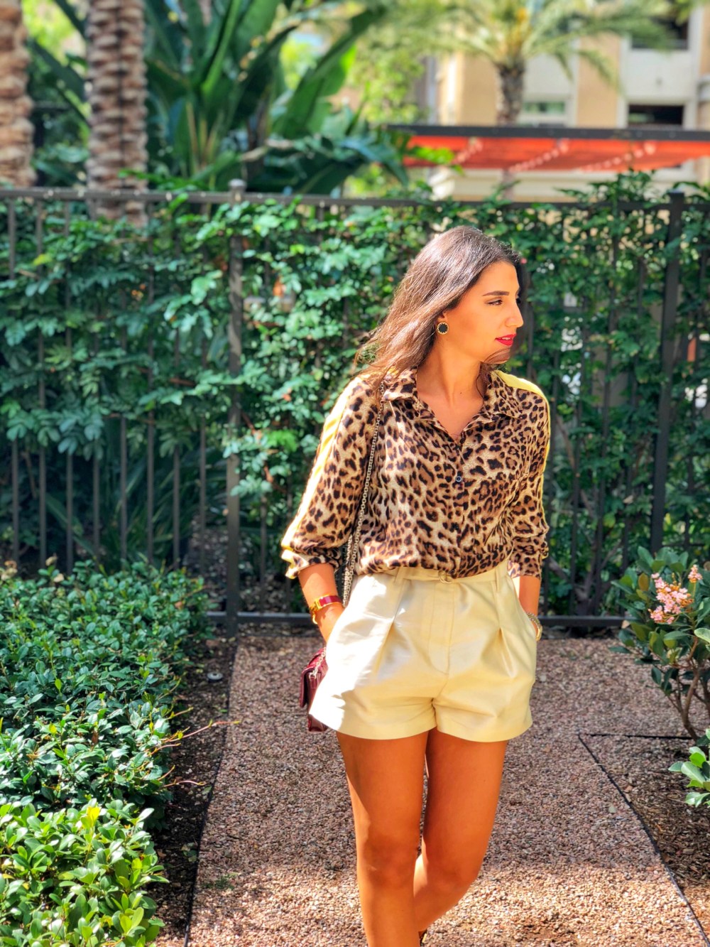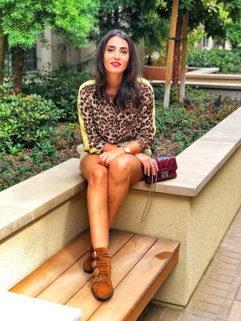 Leopard, snakeskin, zebra, cheetah, all the wild prints are back for fall! You’ve probably seen them in every designer’s fall collection. These bold animal prints make any outfit look chic, you can never go unnoticed. This weekend I decided to indulge in my animal instinct.. I am wearing a leopard print shirt from SheIn. I love the side detailing on the sleeves making it easy to dress down. These origami shorts from 3.1 Phillip Lim with their silk detailing compliment the shirt well. Paired with Givenchy buckle ankle boots and Dior woc.